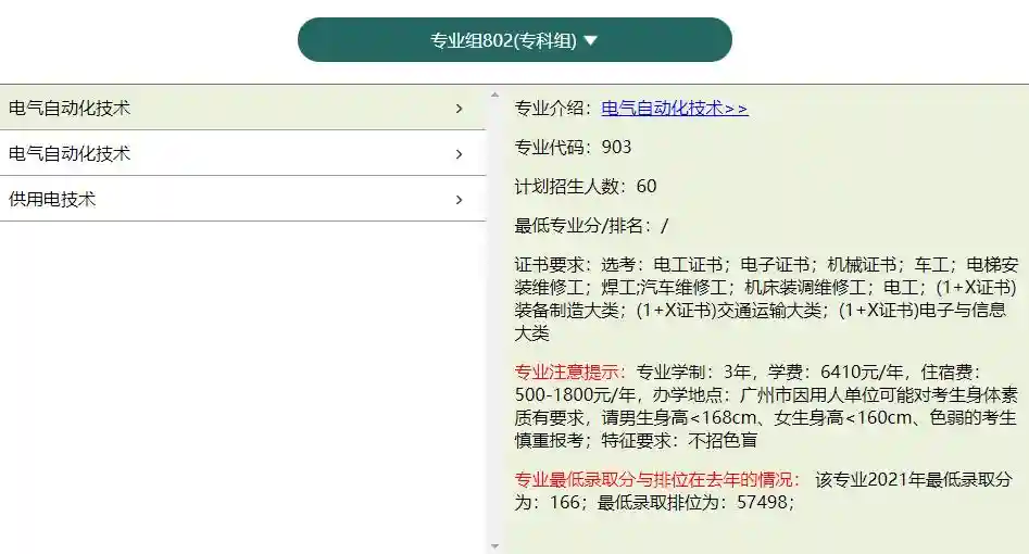 再看,广州铁路职业技术学院802专业组,电气自动化专业,选考证书要求为电工证书;电子证书;机械证书;车工;电梯安装维修工;焊工;汽车维修工;机床装调维修工;电工;(1+X证书)装备制造大类;(1+X证书)交通运输大类;(1+X证书)电子与信息大类。