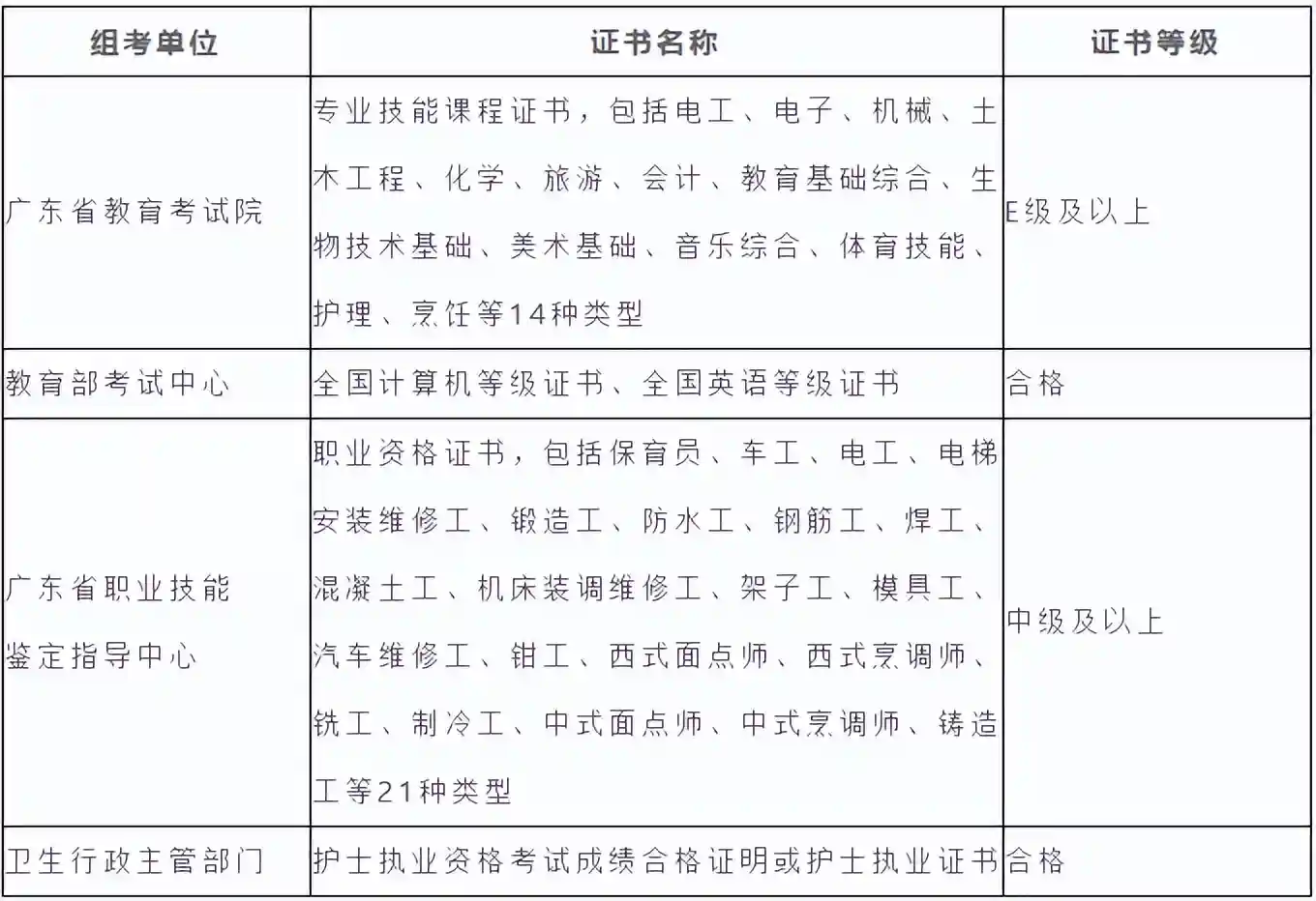 须取得证书等级:烹饪证书;西式面点师;西式烹调师;中式面点师;中式烹调师;(1+X证书)粤菜制作职业技能等级证书;(1+X证书)粤点制作职业技能等级证书;专业技能课程证书C级及以上;(考生须取得上述之一的证书/证明)