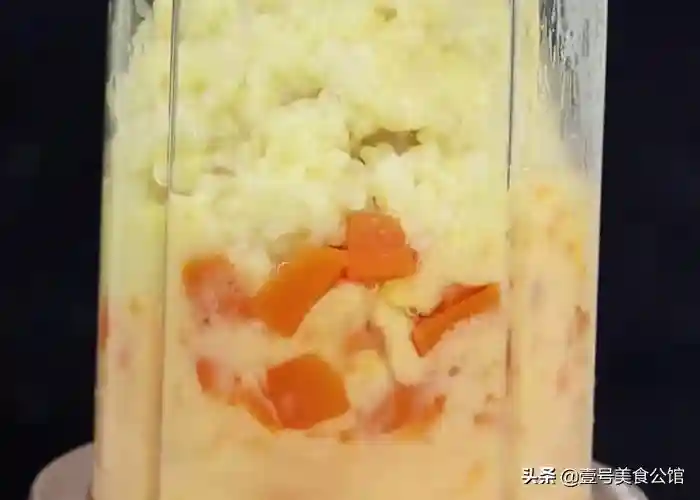 第二步:准备一个榨汁机,先把胡萝卜、鸡蛋、白糖三者倒入榨汁机中,适当打制30秒后,再把泡好的小米倒入,均匀打制成小米糊。对于这步而言,如果你做成的美食是给宝宝吃的话,尽量多打制一段时间,细腻是宝宝饮食吸收的第一步,若是做给5岁以上的孩子吃,只需稍微打制成常态小米糊就可以了。