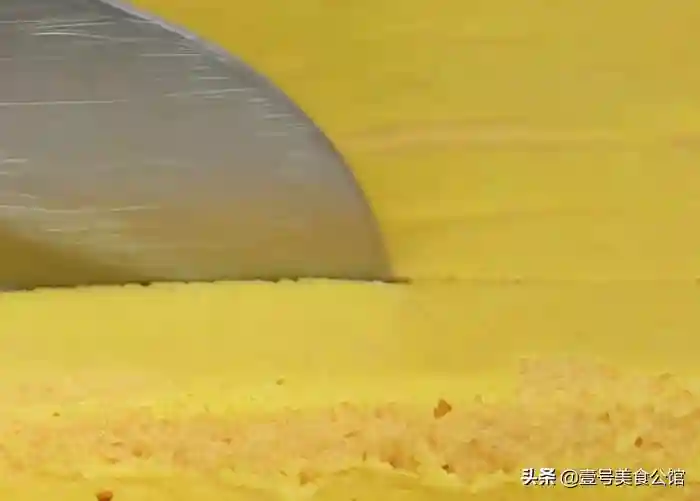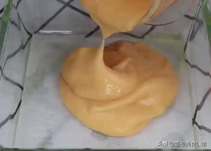 第四步:之后我们把准备好的小米糊倒入容器中,然后用勺子的背面把小米糊铺平,并且适当震几下排气。