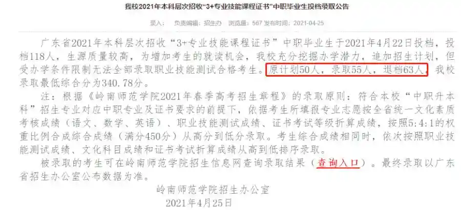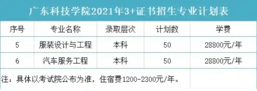 2021年广东科技学院服装设计与工程专业、汽车服务工程专业面向3+证书招生,共计划100人,但是报名该校的人数较少,两专业一共18人参加了职业技能测试,其中两人不合格,其余16人被录取。