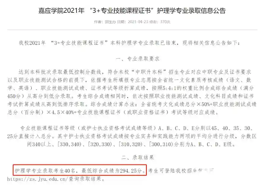 2021年,嘉应学院护理学专业录取考生40名,最低综合成绩为294.25分。