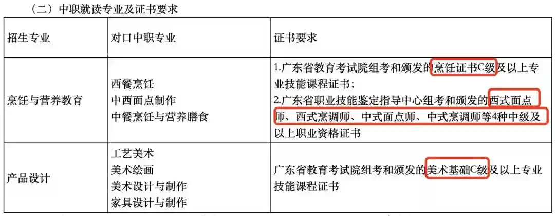 证书要求:广东省教育考试院组考和颁发的烹饪证书,或广东省职业技能鉴定指导中心组考和颁发的西式面点师、西式烹调师、中式面点师、中式烹调师等4种中级及以上职业资格证书。考生须获得上述之一证书(证明)