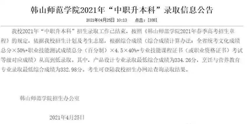 2021年韩山师范学院3+证书本科批次两个专业面向中职生招生,其中产品设计专业录取最低综合成绩为334.26分。烹饪与营养教育专业录取最低综合成绩为332.98分。