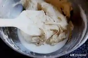 6.加入三分之一的牛奶,切板均匀。再按照粉→牛奶的顺序,把粉类和牛奶全部加完。