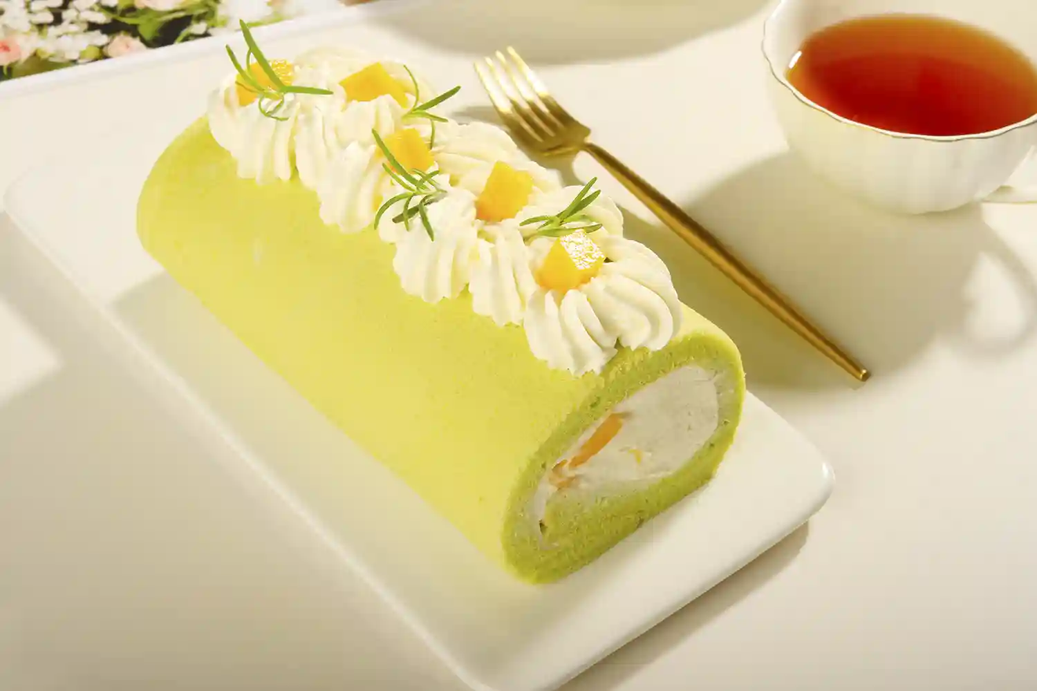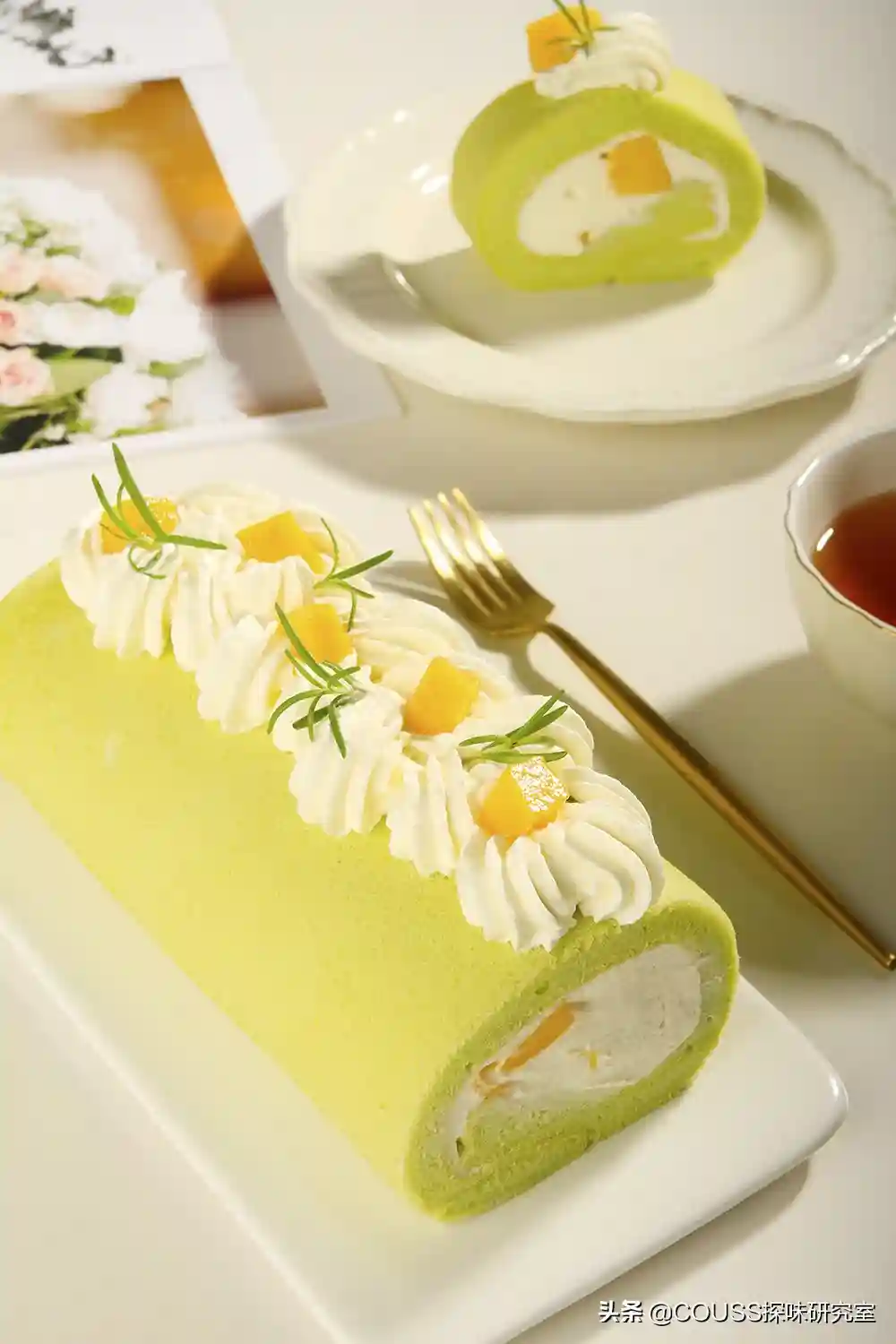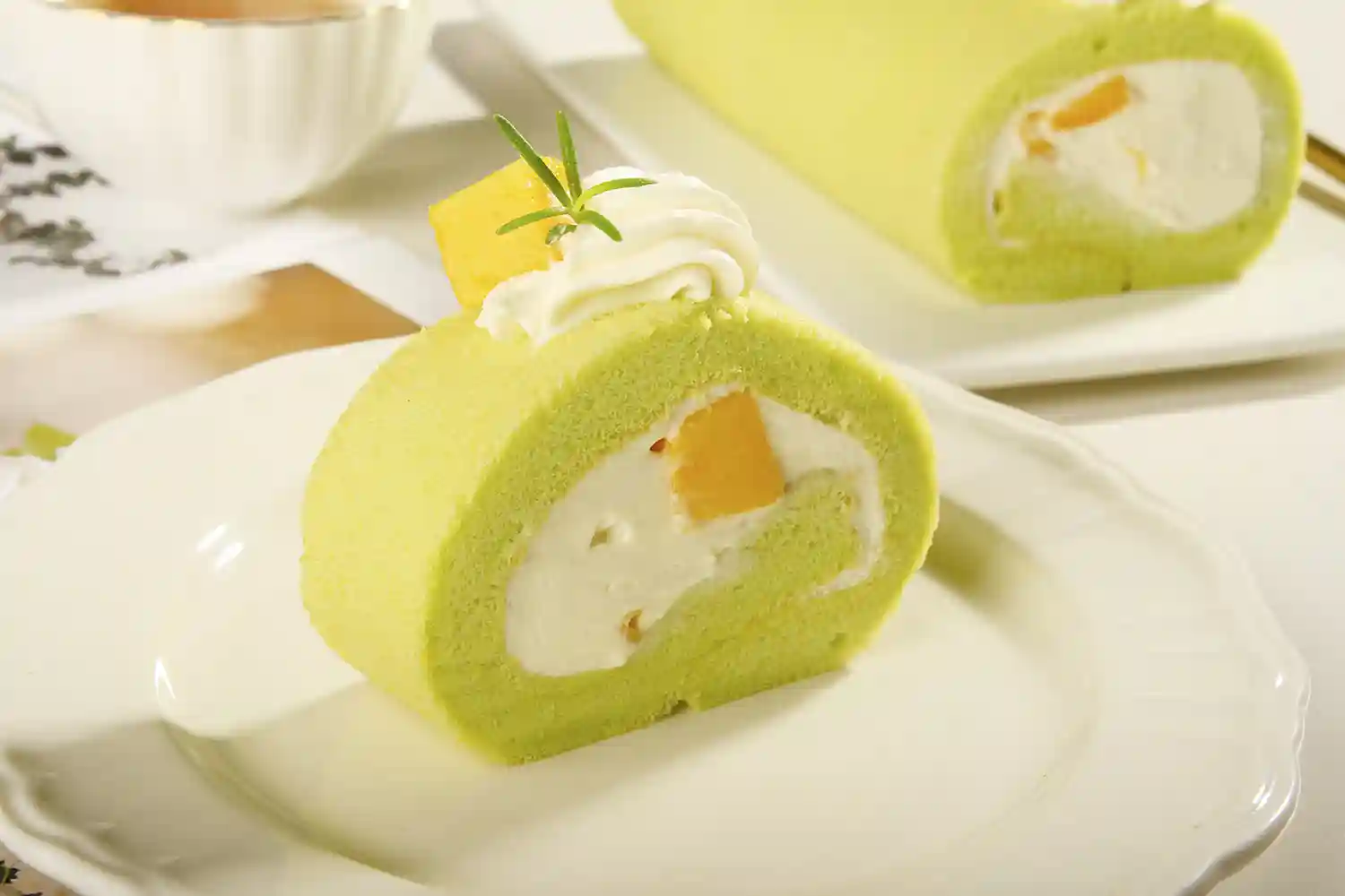 这款蛋糕卷加入了由斑斓叶打成的浅绿色斑斓汁,有一种特别的淡淡天然清香。再搭配上酸酸甜甜的芒果奶油,更是直接升华了蛋糕卷的口味层次。吃起来清新柔软,齿颊留香,让人回味无穷。