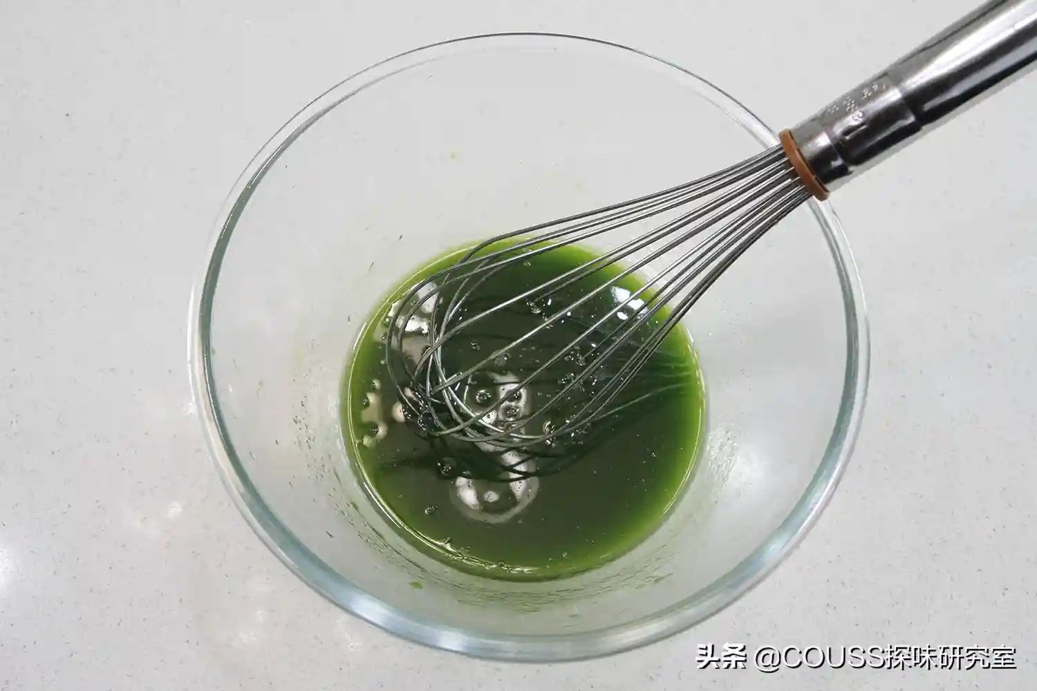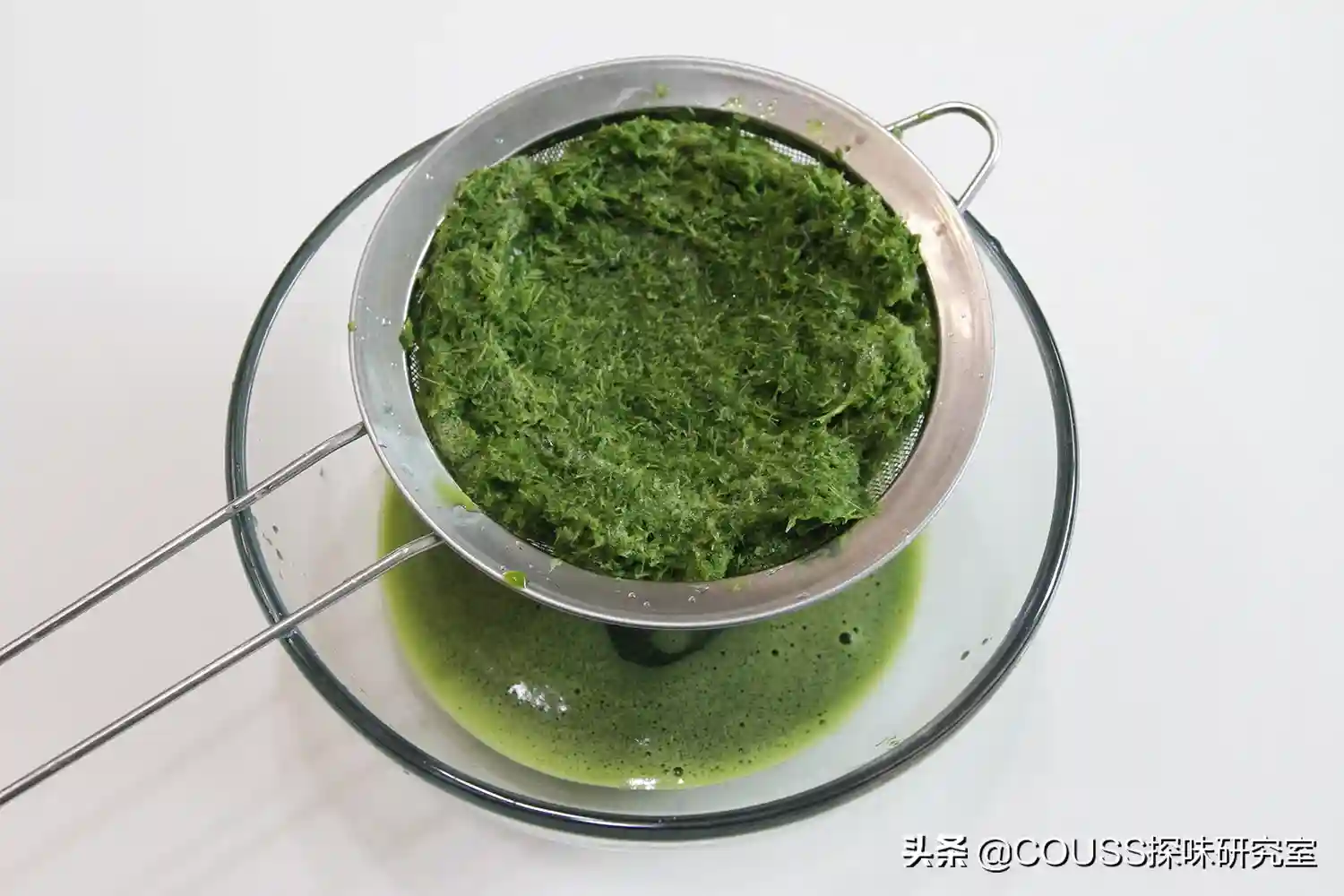 「1」斑斓叶洗干净后剪成小块,和水一起放入料理机打碎,用纱布或者密网过滤出斑斓汁;