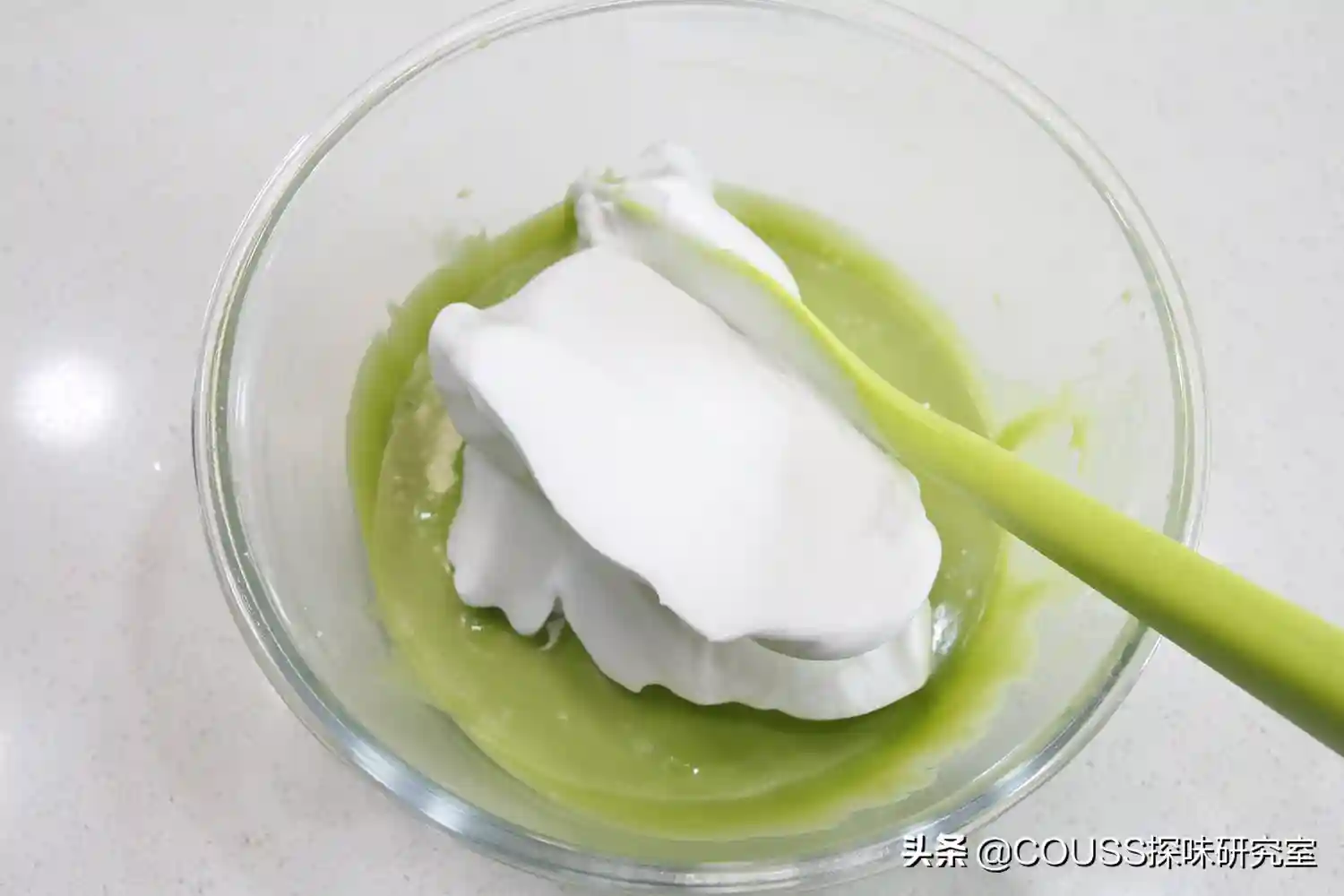 「6」混合面糊:先取三分之一的蛋白霜加入到斑斓蛋黄糊中切拌均匀,再将拌好的面糊倒入到剩下的蛋白霜中,快速切拌均匀成细腻的面糊;