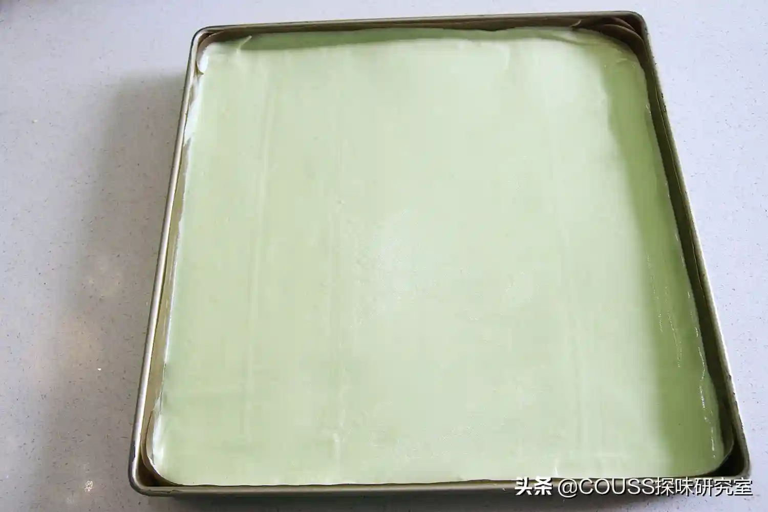 「7」将拌好的面糊从高处倒入垫了没布的方形烤盘中,借助刮刀将面糊铺平整,并轻震出大的气泡;
