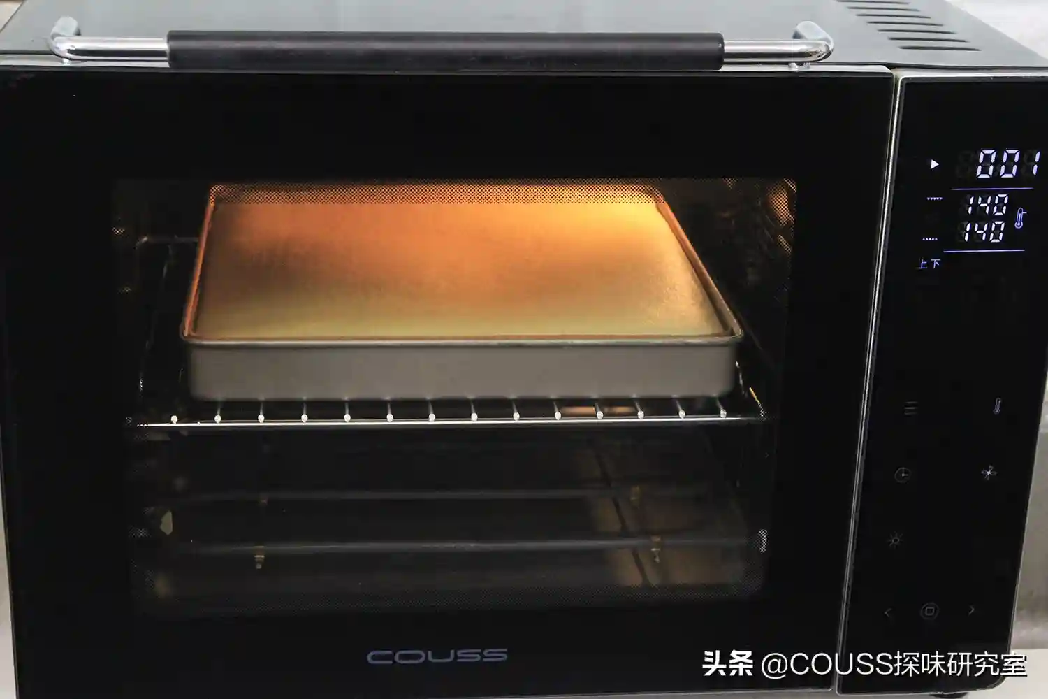 「8」烤箱提前上下火160度预热好,蛋糕放入中层烤网,温度调整为上下火140度,烘烤约30分钟,最后3分钟可开启热风循环烘烤,使蛋糕表皮干爽一些;