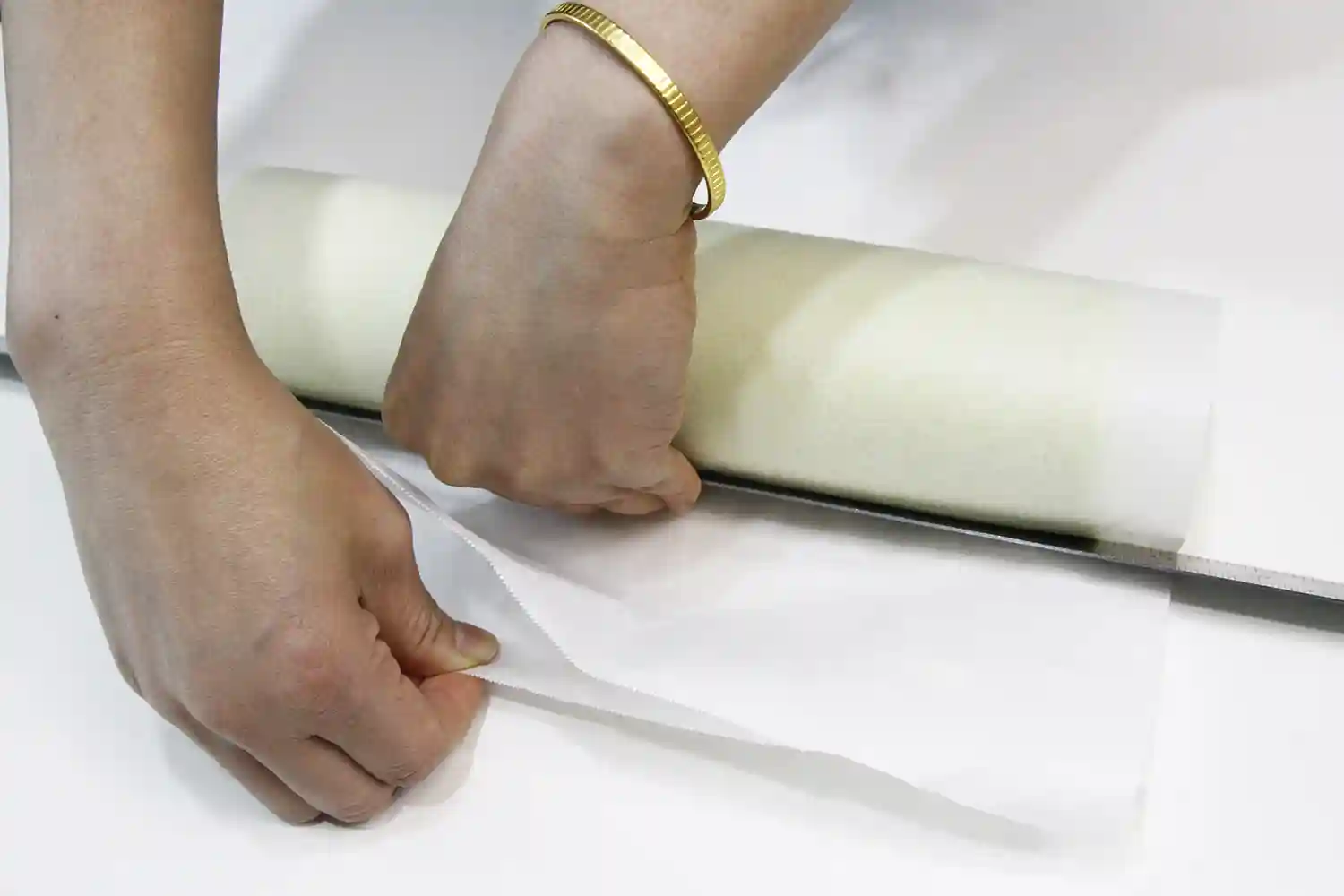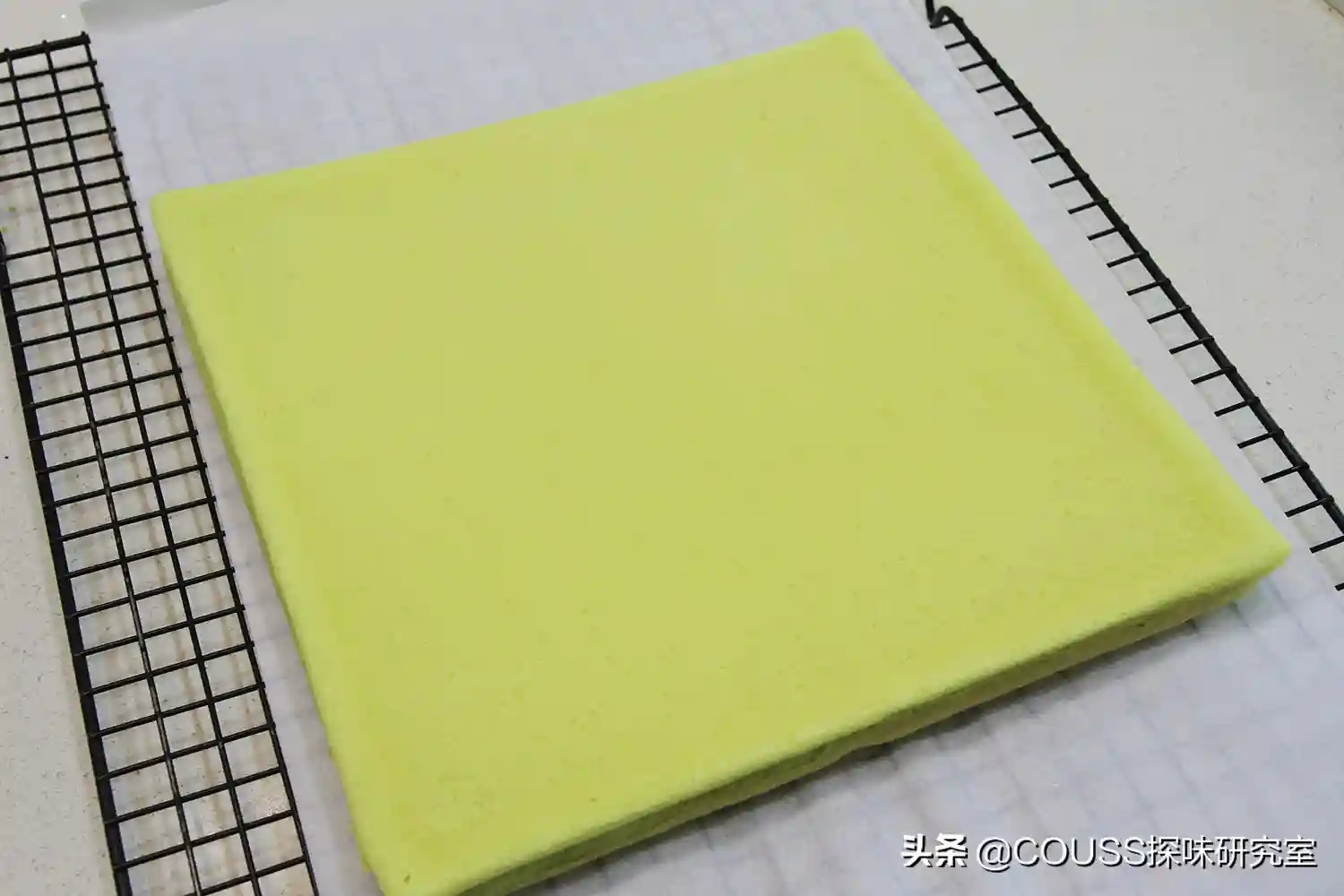 「9」烘烤结束后蛋糕卷出炉,提起油布将蛋糕卷脱出烤盘放网架上,撕去周边油布稍晾凉一会至温热,表面垫油纸将蛋糕卷翻面,撕去底部油布后再把蛋糕卷翻过来,表面虚盖一张油纸防止水份过多流失风干;
