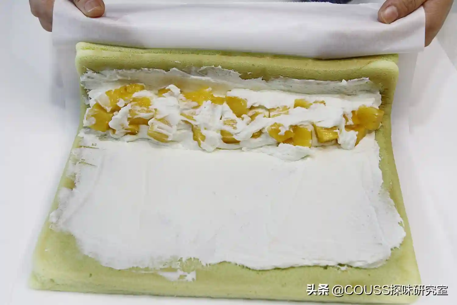 「11」卷制:台面垫油纸,冷却的蛋糕卷正面朝上,抹上奶油霜后铺芒果粒,借助擀面杖及油纸将蛋糕卷卷好,包好冷藏定型30分钟以上;