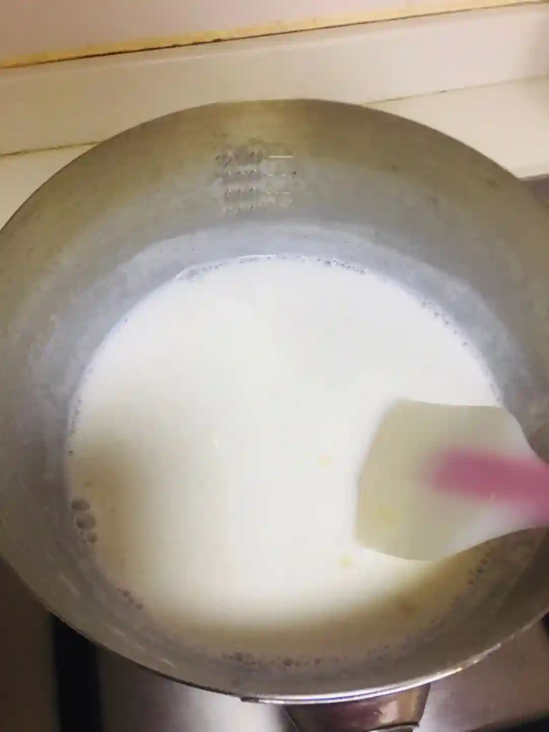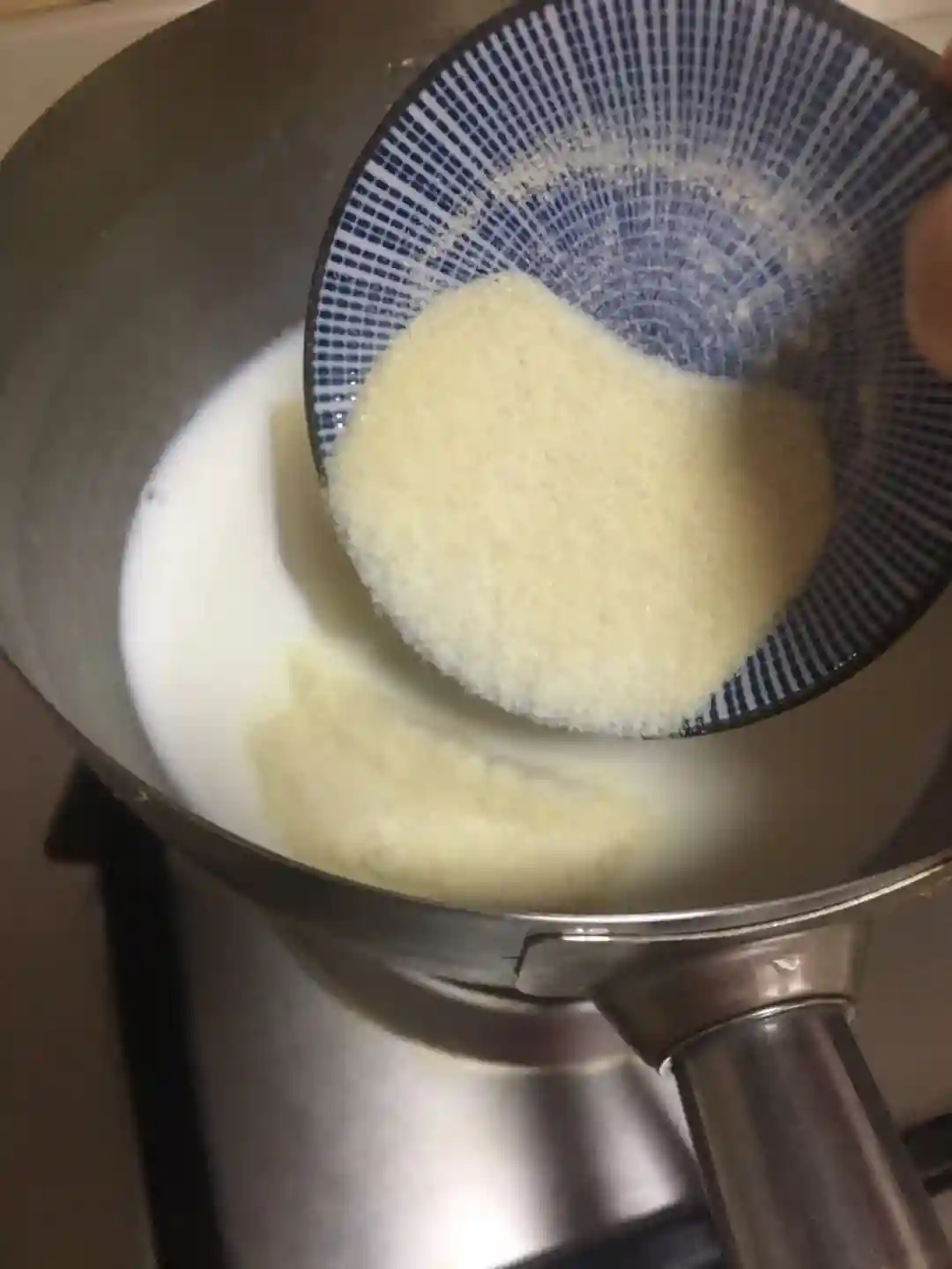 3/奶锅里加入牛奶、白糖、吉利丁粉,开小火加热,不停搅拌,使其溶化