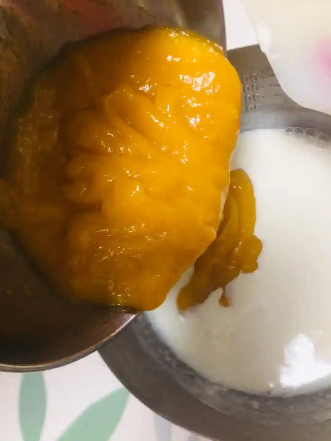 5/再将芒果泥倒入,混合搅拌均匀