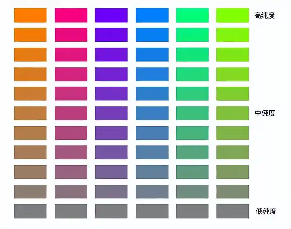 纯度最高的色彩就是原色,三原色纯度最高、二次色次,三次色纯度最低,混合的色彩越多,纯度越低;随着纯度的降低,就会变化为暗淡的没有色相的色彩,纯度降到最低就是失去色相,变为无色。