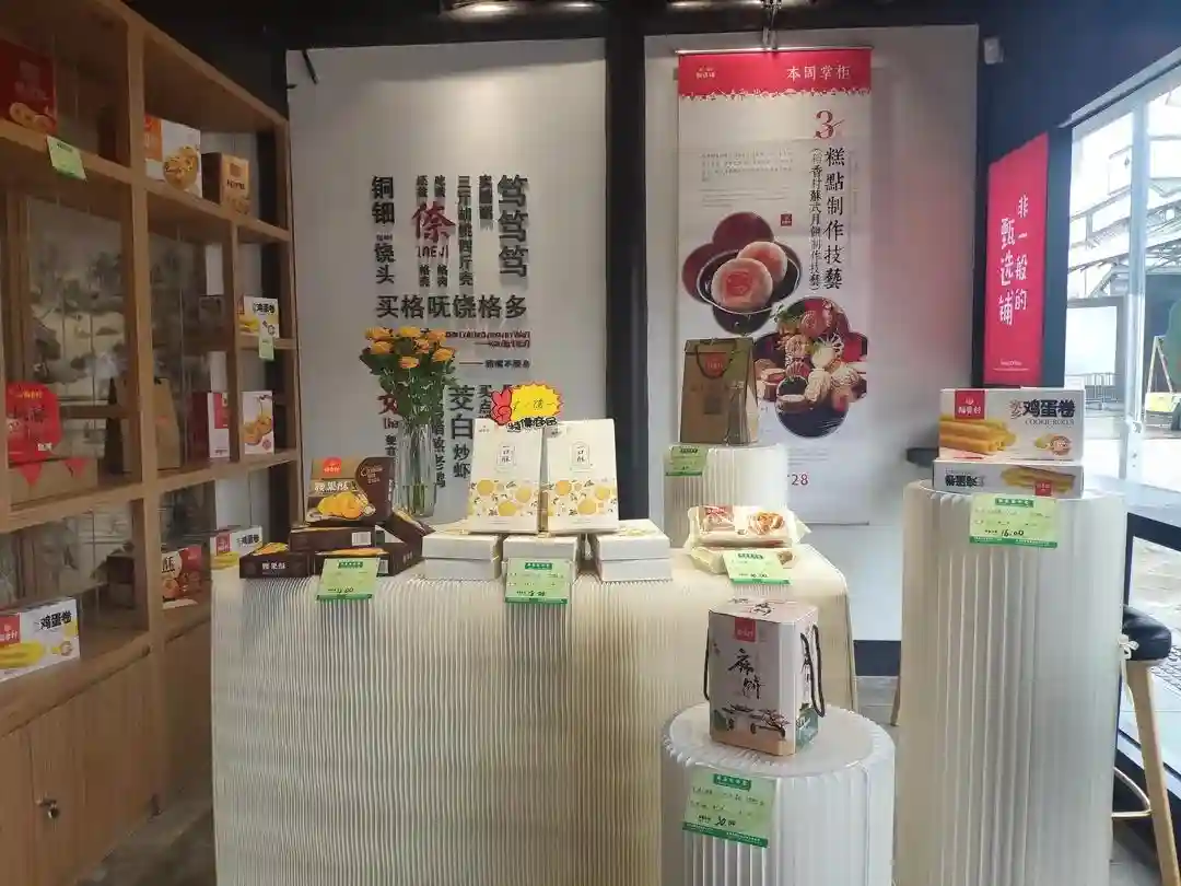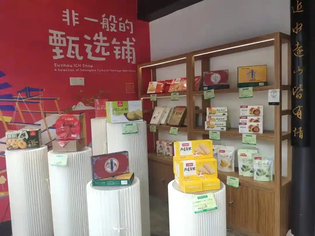 走进店铺,可以看到柜台上摆放着袜底酥、松子枣泥麻饼、一口酥等传统苏式糕点,还有咸蛋黄酥、爆浆麻薯、凤梨酥等新式点心,这些都是苏州人熟悉又喜爱的味道。掌柜还十分贴心地准备了绿豆冰糕和茯苓夹饼供游客试吃,炎炎夏日里为大家带来一丝清爽甜蜜。