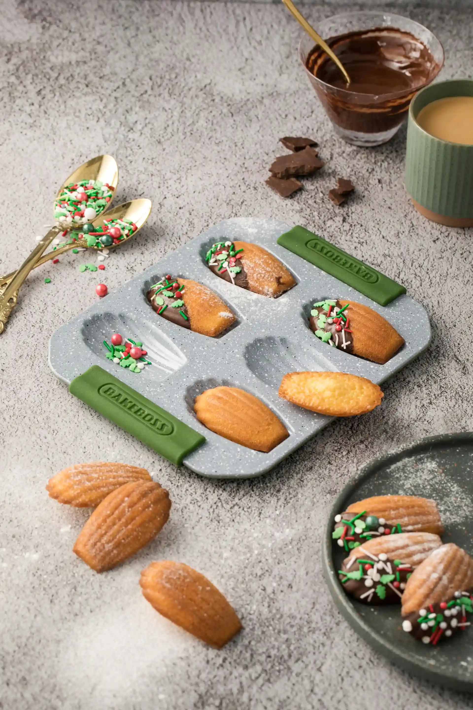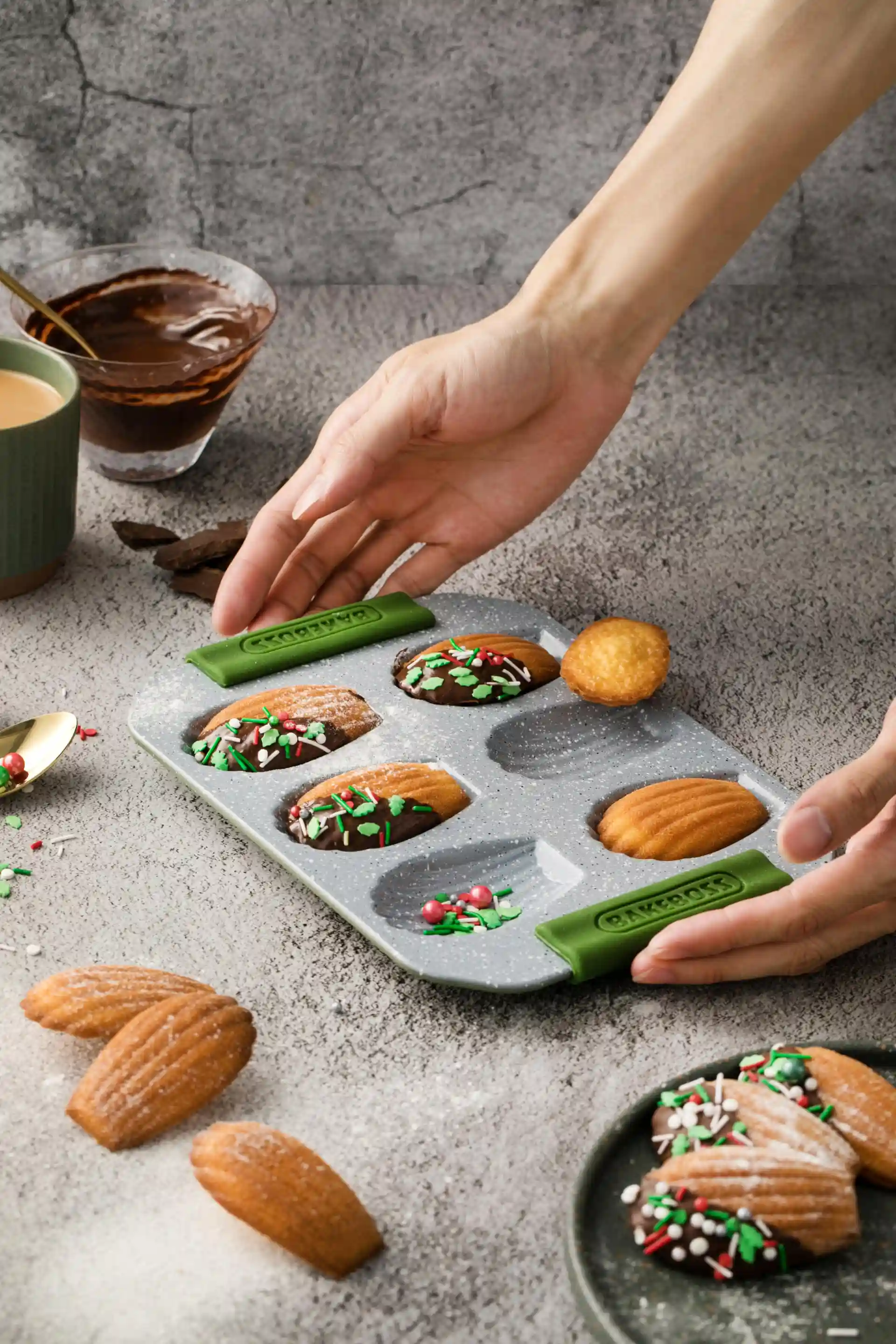 在这里,我使用的是焙博士BAKEBOSS家的橄榄绿6连玛德琳蛋糕模具,材质是德国原石颗粒层材质制作,档次很高,做工精致,很好脱模,两侧硅胶防烫抓手也很实用了,欧美风的颜值也是很打动我的点。焙博士BAKEBOSS已经凭借烘焙用品的研发和市场投放经验,于2018年焙博士BAKEBOSS商标受到欧洲30多个囯家的认可和保护,用起来也是很有成就感。同年焙博士加大投放力度,引进现代化自动生产流水线,引领中国家用蛋糕模具的变革突破,创造出更适合中国家庭的灵感蛋糕模具。大概就是应了本文中的大文豪马塞尔·普鲁斯特的话:每一口玛德琳,都散发出诱人的光彩让人挪不开眼睛,像白云又像微风甜意着我们的心窝。