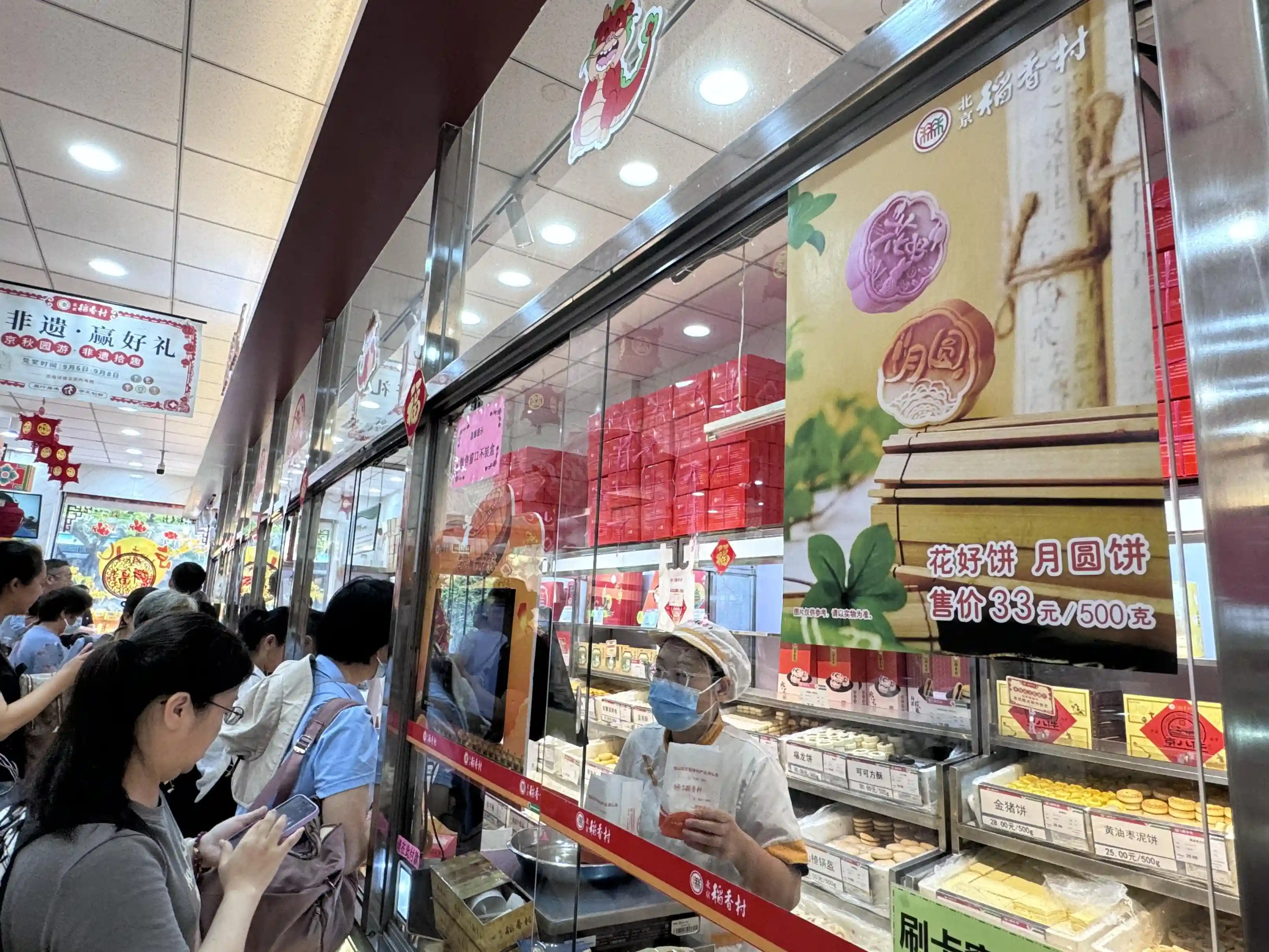 椰奶流心乳酪馅的“花好饼”、芒果芋泥馅的“月圆饼”、薄荷味的绿豆冰酥、酸梅冰糕、山楂馅的“颐和雅色”、枣蓉馅的“枣满福枝”……隔着柜台玻璃看去,新品糕点出货速度最快,口感香甜、花纹精美的“枣满福枝”已经一整筐都见了底。“这几款时令糕点卖得特别好,一天能卖出好几箱。”店员说。除了新口味的糕点,为了迎中秋特别印制了祥云花纹的山楂锅盔、枣泥方酥等热门“老选手”也受到顾客青睐。