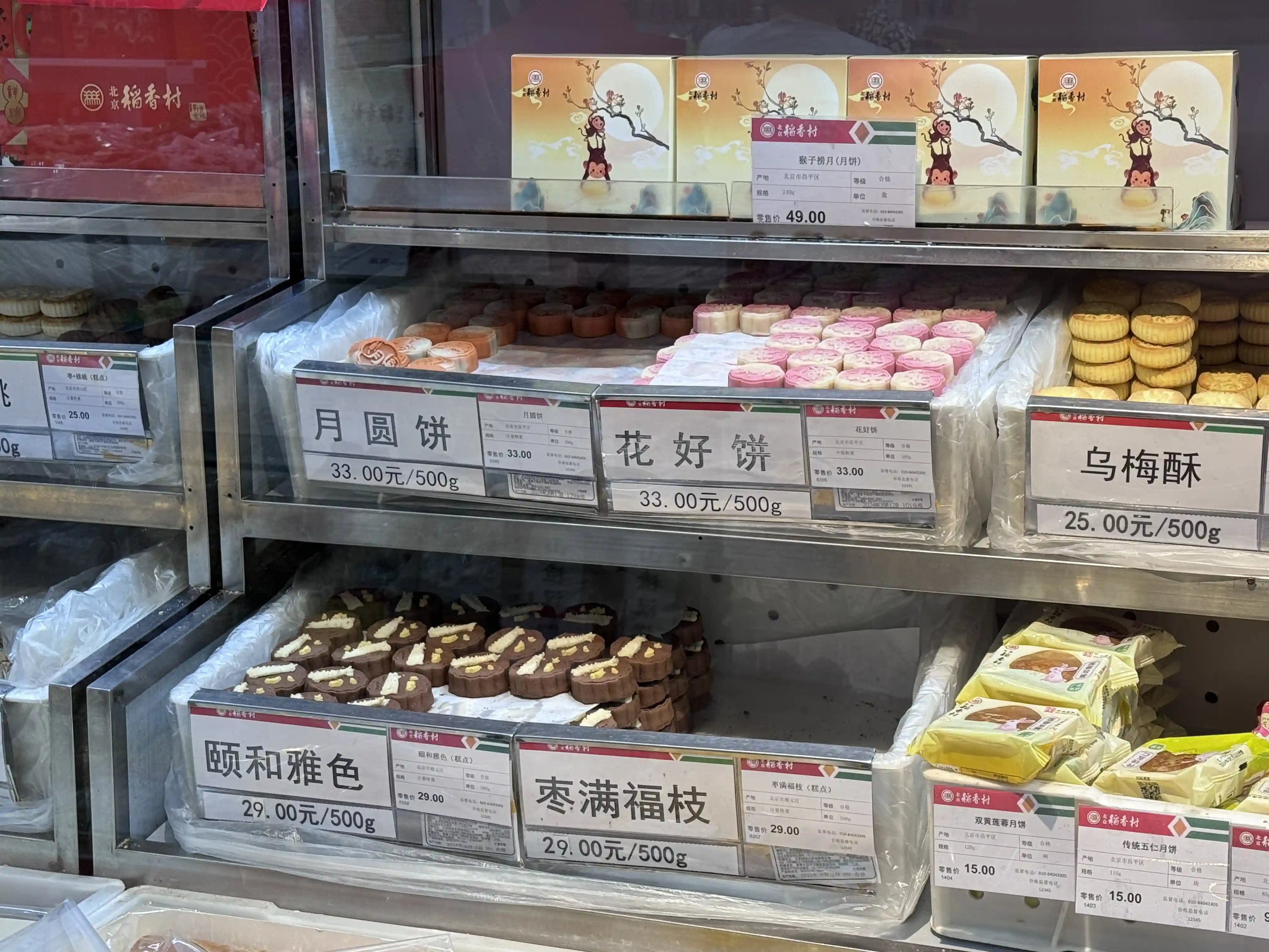 椰奶流心乳酪馅的“花好饼”、芒果芋泥馅的“月圆饼”、薄荷味的绿豆冰酥、酸梅冰糕、山楂馅的“颐和雅色”、枣蓉馅的“枣满福枝”……隔着柜台玻璃看去,新品糕点出货速度最快,口感香甜、花纹精美的“枣满福枝”已经一整筐都见了底。“这几款时令糕点卖得特别好,一天能卖出好几箱。”店员说。除了新口味的糕点,为了迎中秋特别印制了祥云花纹的山楂锅盔、枣泥方酥等热门“老选手”也受到顾客青睐。