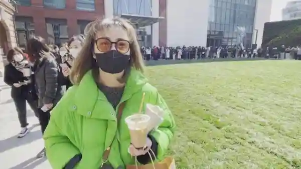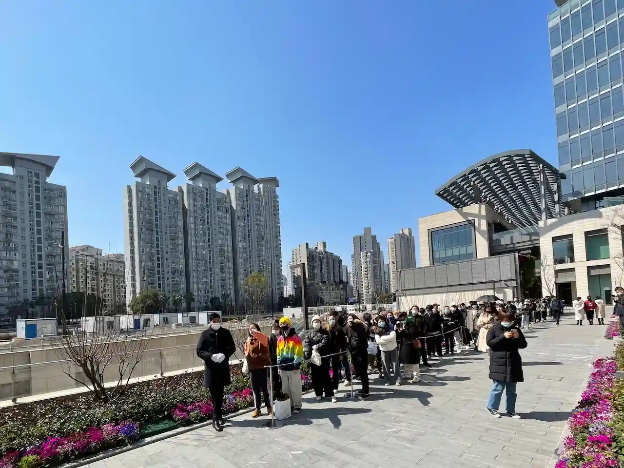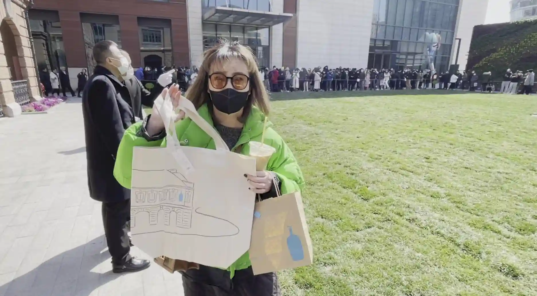 长安路908号的清水红砖外墙上蓝色的瓶子格外显眼,顺着人潮往里走,正对这栋楼的数条队伍足以说明了它的人气。午间约11时,据现场工作人员透露,当前排队入店须大约3-4小时。每条队伍都配有安保人员,提醒人们保持社交距离,佩戴口罩。