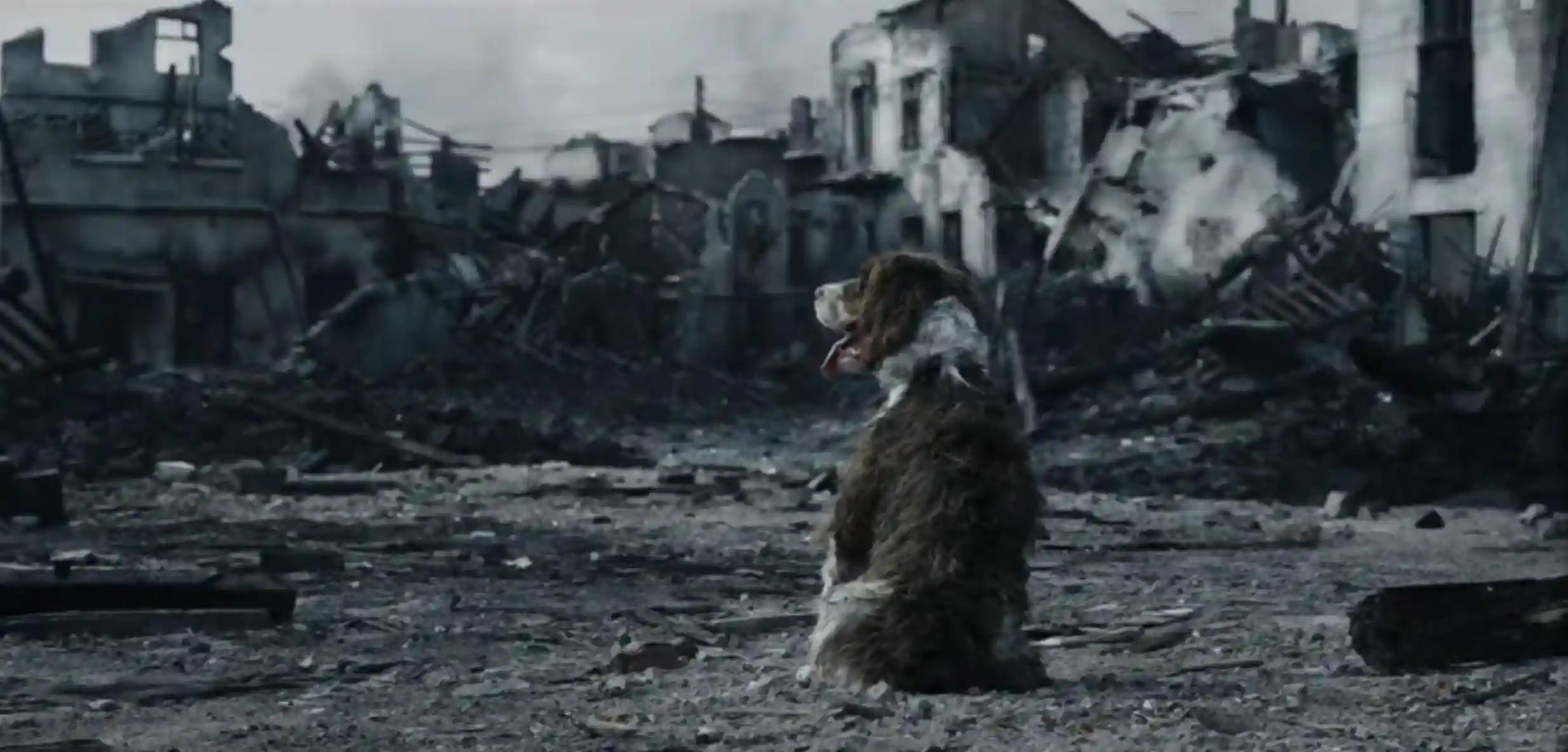 一只是坐在广州城废墟前,眼神迷茫的中国流浪狗,等着下一轮轰炸降临。