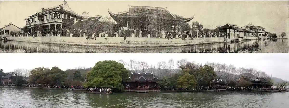 (上)90年前的杭州孤山;(下)中国美术学院90周年校庆时候的孤山