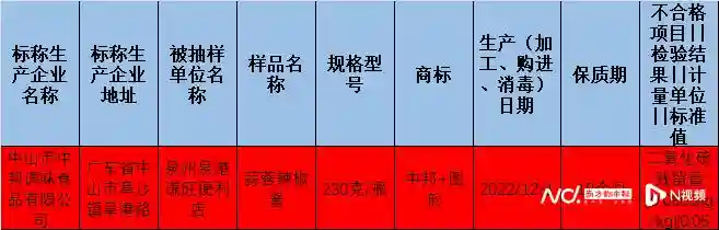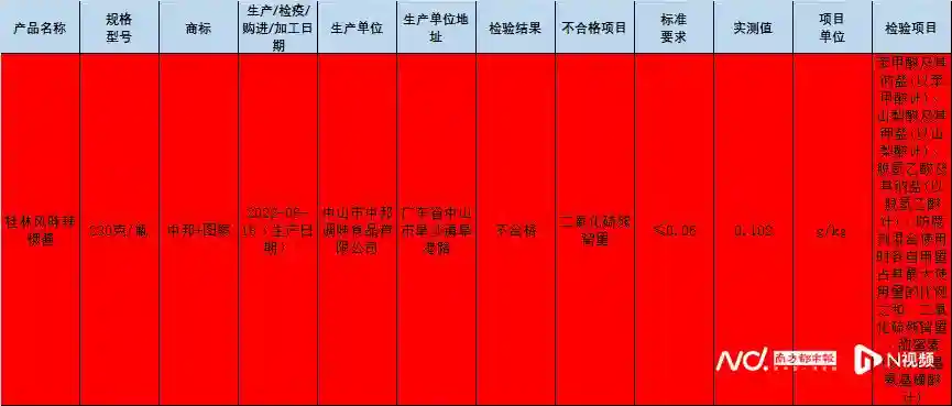 此次12批次不合格产品中,有1批次调味品被检出二氧化硫残留量超标,为标称由中山市中邦调味食品有限公司生产,商标为“中邦+图形”的蒜蓉辣椒酱(规格型号:230克/瓶;生产日期:2022年12月1日),其二氧化硫残留量检出为0.0806g/kg,而标准值为0.05g/kg,为标准值的1.612倍。