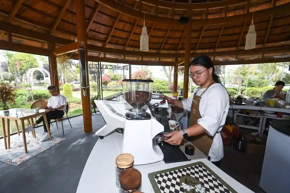 工作人员在浙江湖州织里镇伍浦村渔耕文化园的陶湾里乡村咖啡店工作。新华社记者徐昱摄