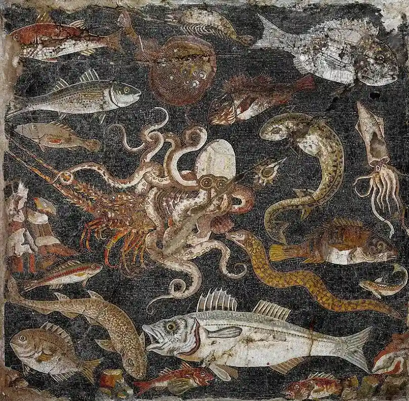 来自《》那不勒斯国家考古博物馆收藏的约公元前100年-公元79年庞贝古城的海洋生物马赛克