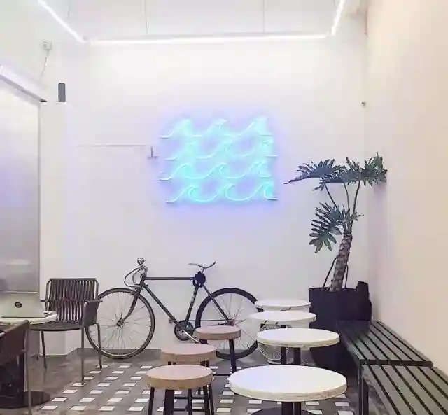 这是一个台湾老板娘开的清新系网红店,满眼的绿色椰子树配上金属质感的波浪LED灯,颜色搭配十分跳跃的滑板、单车和沙滩椅,即使是堂吃一杯果汁,绿洲间的客人也要守住自己的颜值。
