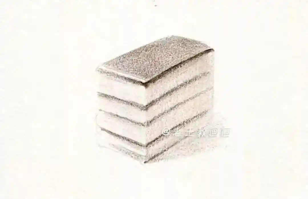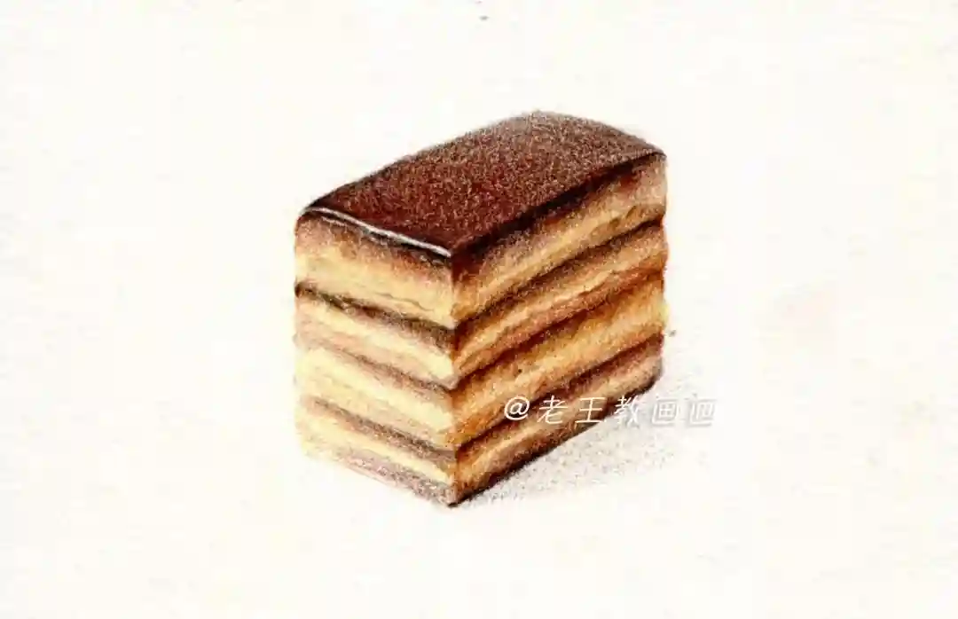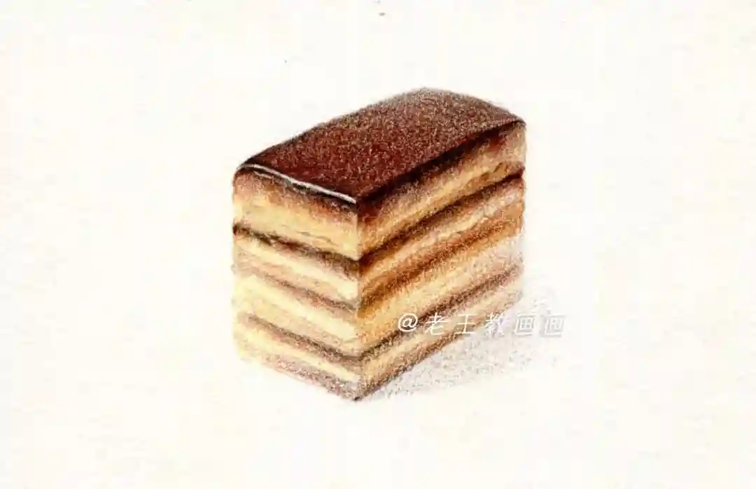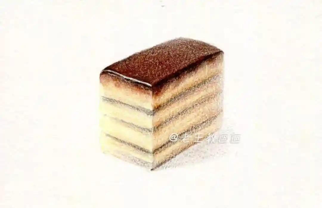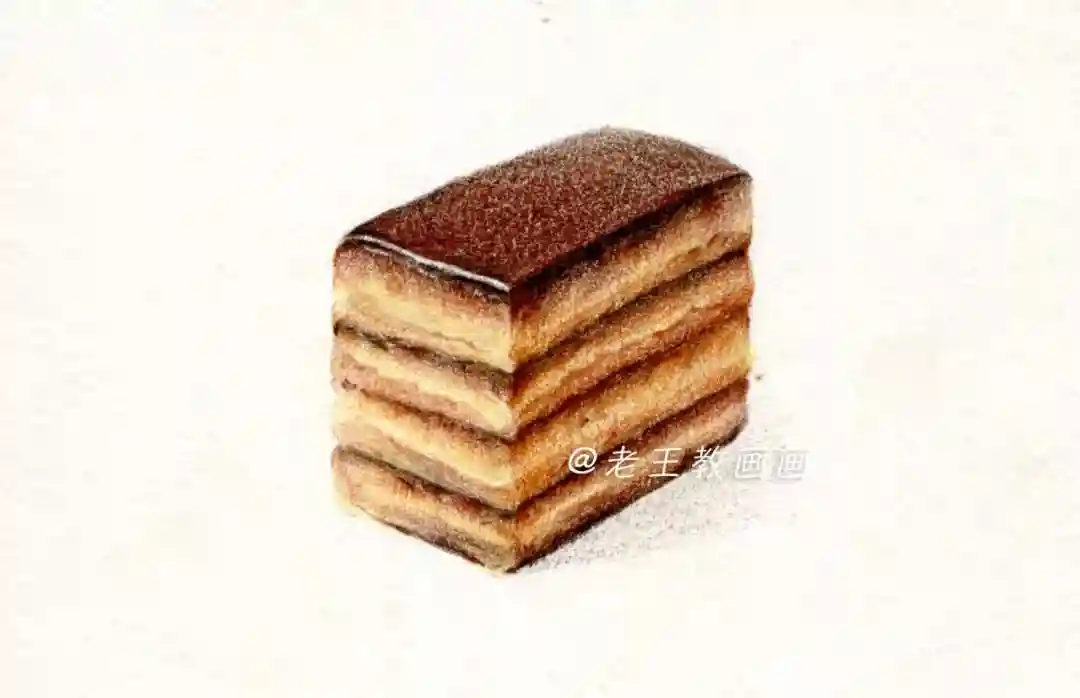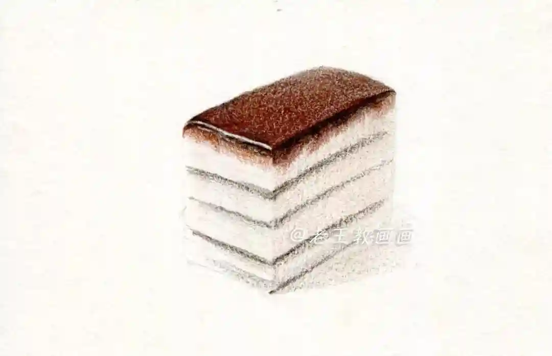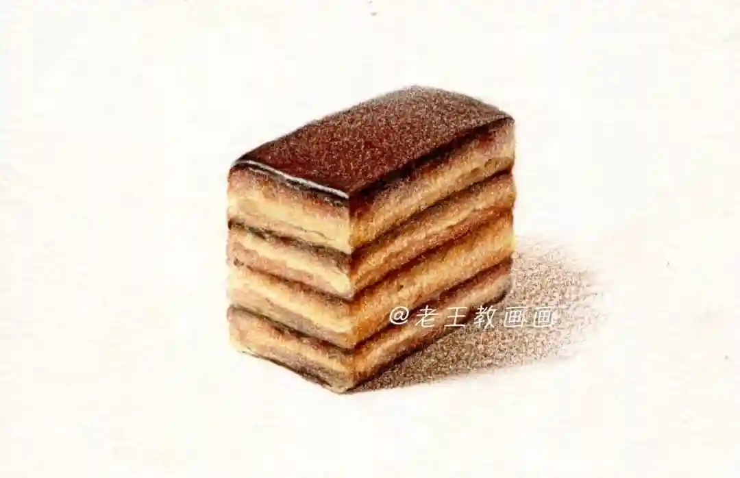 【第7步】:用44号棕色画蛋糕的投影,注意投影形状,近实远虚,一块美味的蛋糕完成了(P9↓)