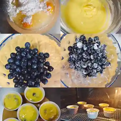 1、1️⃣除蓝莓外,其他所有材料混合,用打蛋器搅一搅至顺滑状态即可。2️⃣清洗等蓝莓撒适量面粉,这样混合面糊时候不易沉底,倒入纸杯里八分满即可。