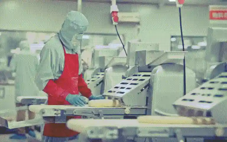 饼皮和馅料都准备完成后,就进入了包馅定型阶段。这一步,又是满满的巧思。咬开轩妈蛋黄酥,你会发现层层叠叠的酥皮下面,还有一层雪白软糯的雪媚娘皮,酥脆和软糯的口感巧妙地融合在一起,让轩妈蛋黄酥的口感十分丰富。雪媚娘的加入,让整个蛋黄酥都有了不同的风情。一层雪白的雪媚娘里,还有惊喜。一层红润清甜的红豆沙,温柔地包裹着咸蛋黄,为它带来鲜香之外又一重额外的甜蜜。包馅的过程,同样是全自动生产线完成的。机器的精密控制,让每一层的分量、厚度都能高度相似,生产线还会对蛋黄酥进行称重检验,只有称重合格的才会被喷上金黄的蛋液,点上黑芝麻,接受烘烤前的造型。造型完毕的蛋黄酥,就可以通过高温烤制激发风味了。轩妈的烤炉十分壮观,隧道式的烤炉有足足42米长,一条“隧道”有多个温区。精细的温区分控,可以确保蛋黄酥即使最中心处也能烘烤到位。