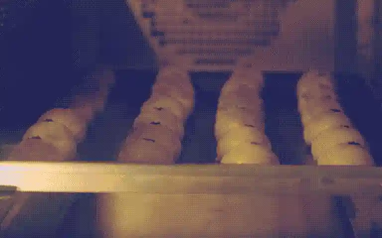 将面团送进开酥机,反复折叠六次,形成两层面一层油的饼皮结构,开酥就完成了