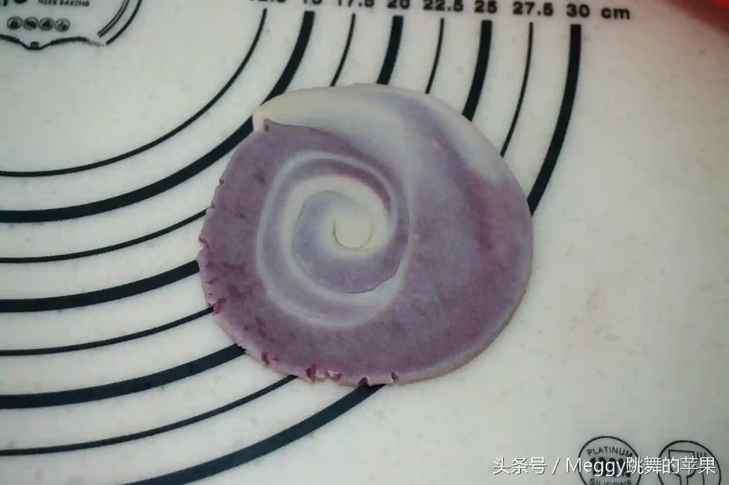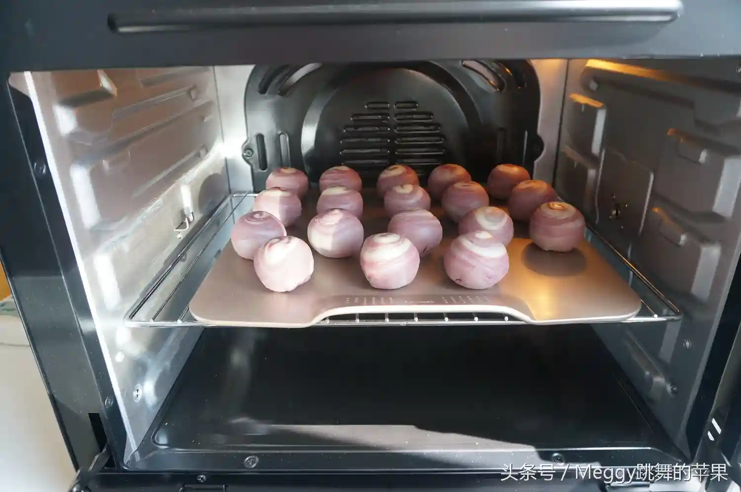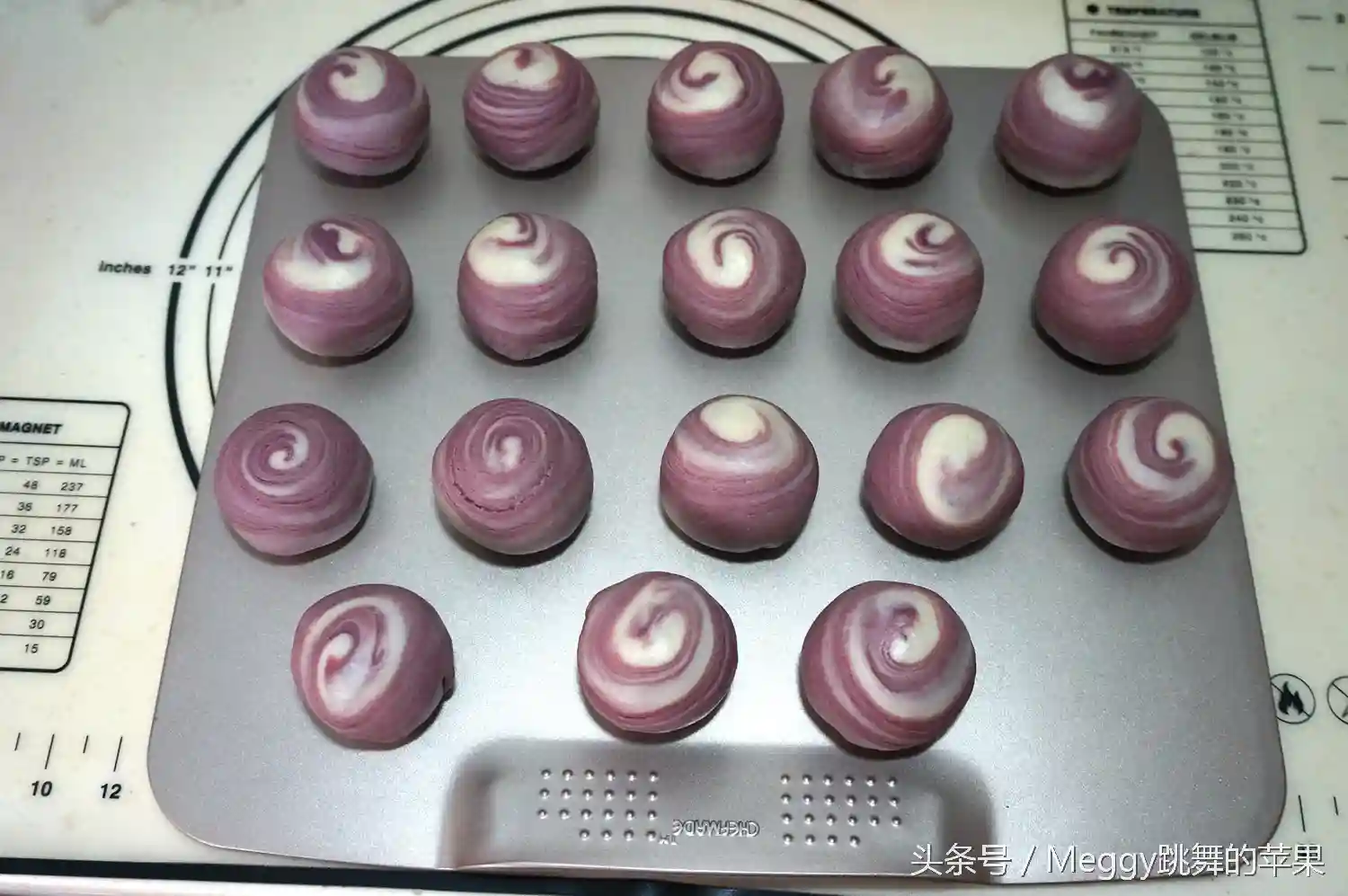 26.一共18个紫薯酥皮,封口朝下放在不粘烤盘上,看,美丽的花纹一圈圈;