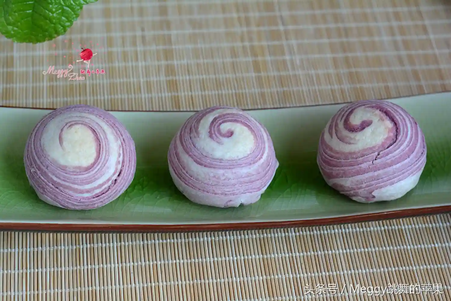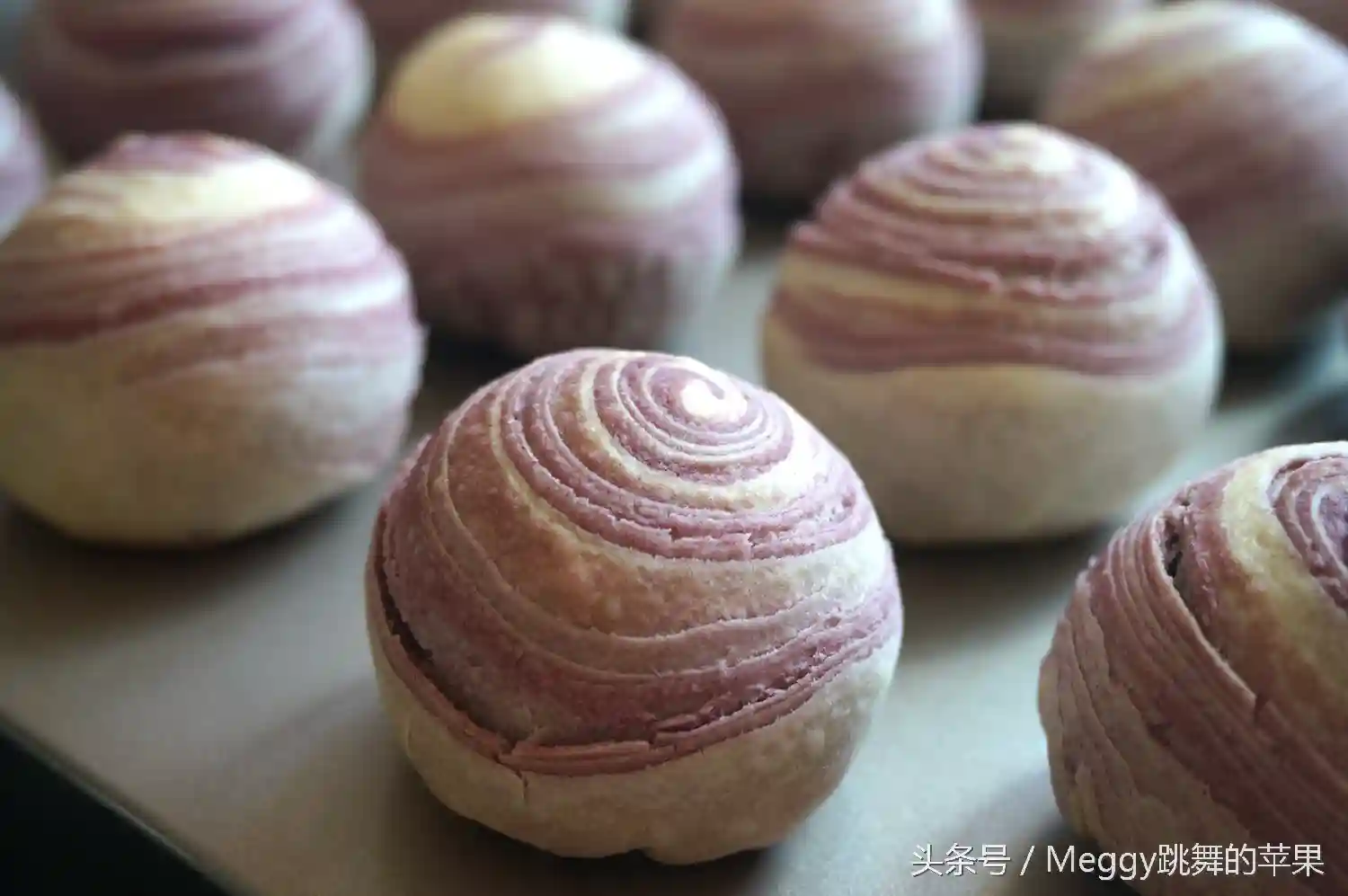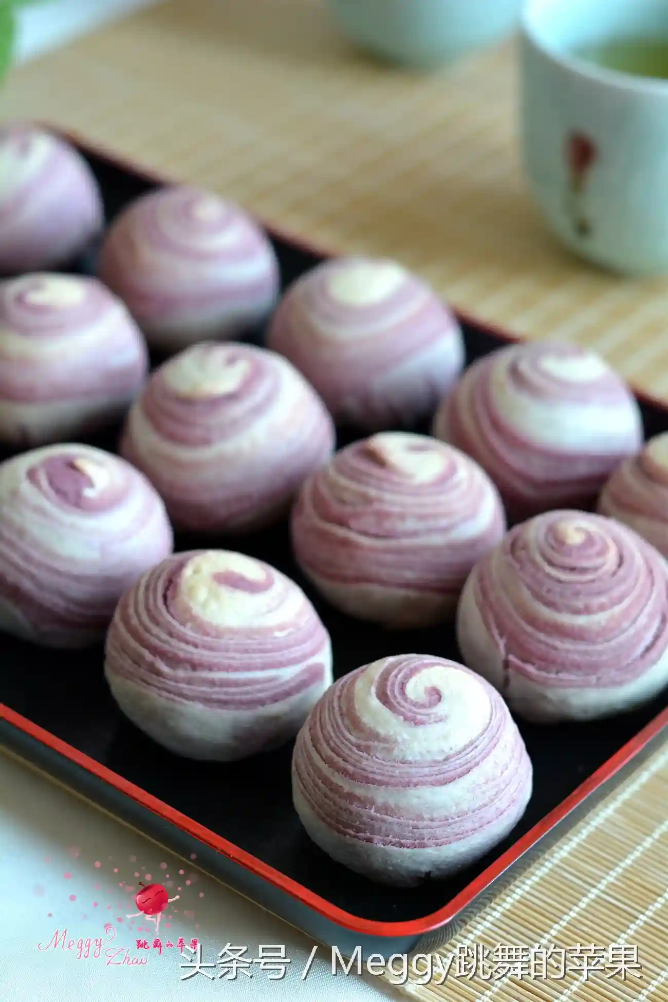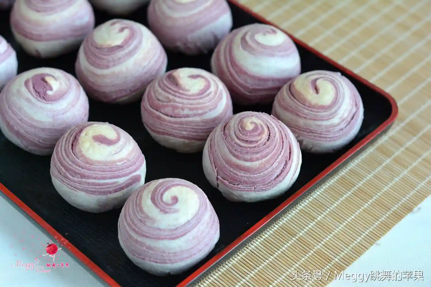 26.一共18个紫薯酥皮,封口朝下放在不粘烤盘上,看,美丽的花纹一圈圈;
