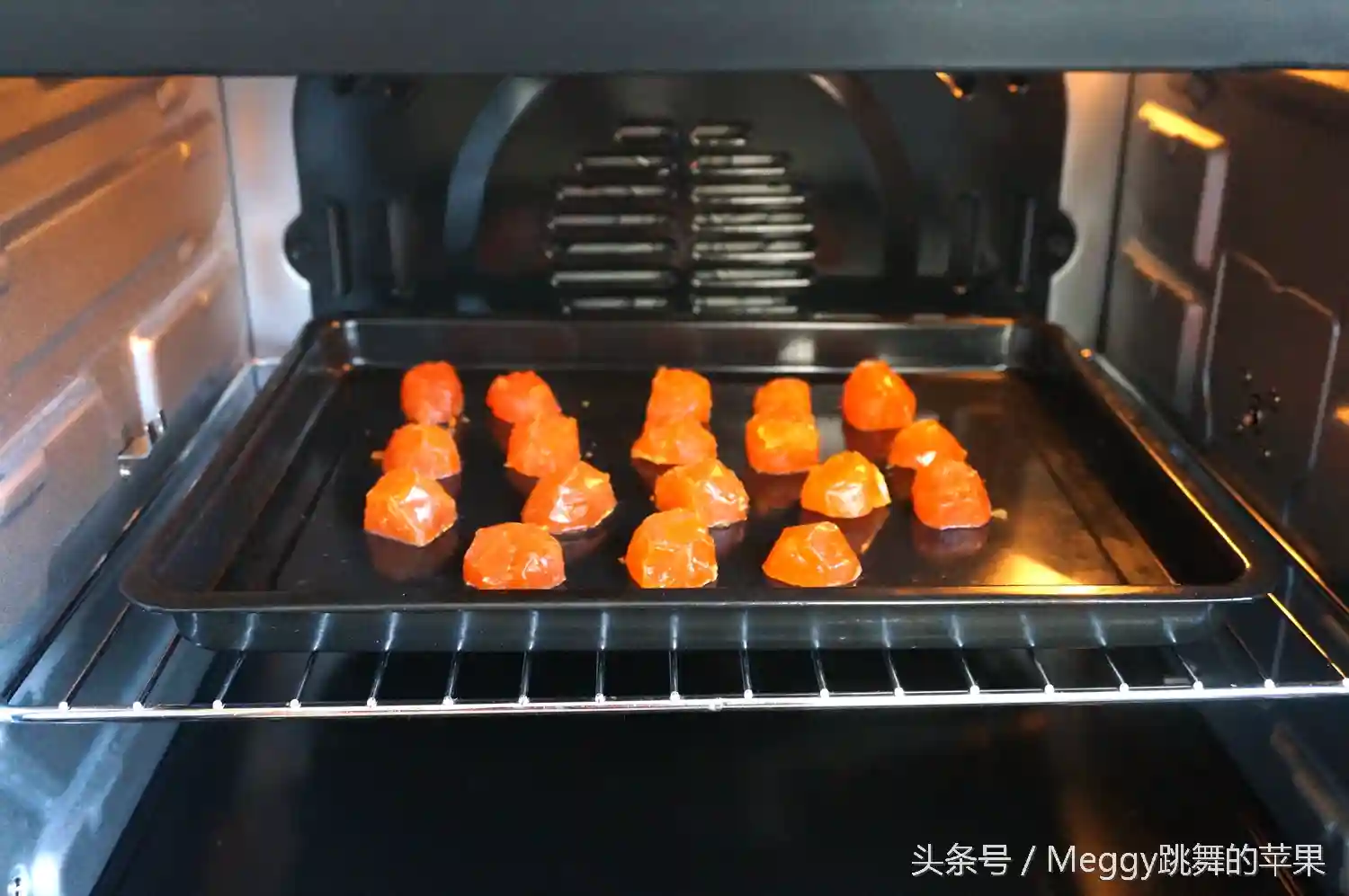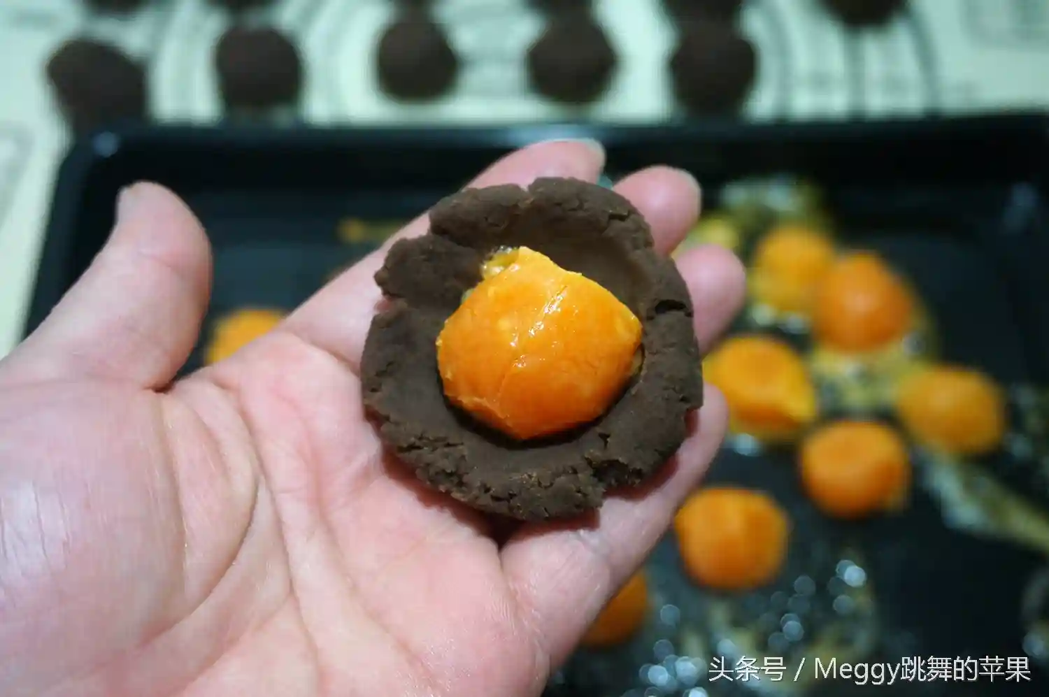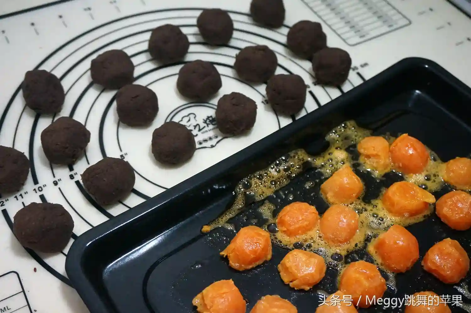9.下面来处理一下咸蛋黄:一个蛋黄分两半,上面喷酒白酒,没有喷壶,用羊毛刷子刷也可以,送入预热好的烤箱中层,190度,6分钟,然后端出自然冷却;