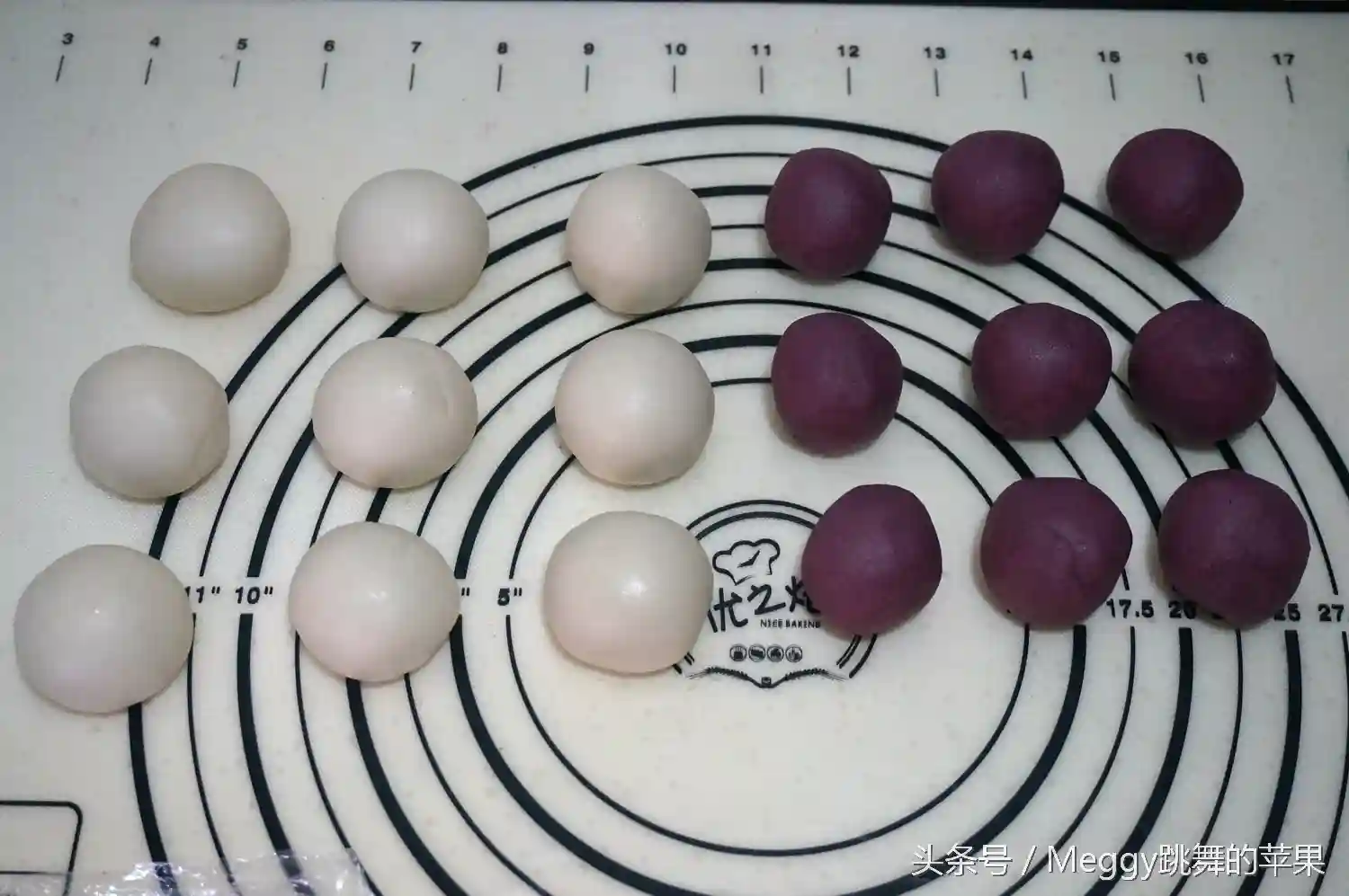 14.将冷藏饧好的水油皮面团和油酥面团称重,各分成9等份,揉成圆球,盖保鲜膜静置10分钟;