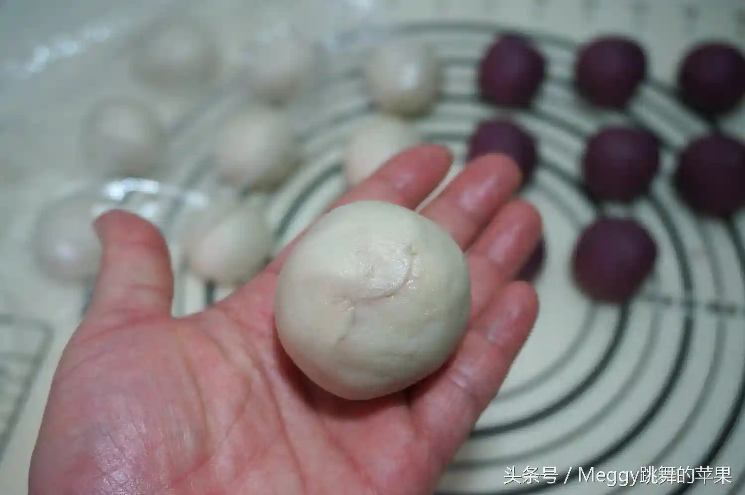 25.左手虎口轻轻握住面团,右手大拇指按住豆沙球,边转边包,封口捏紧捏严;