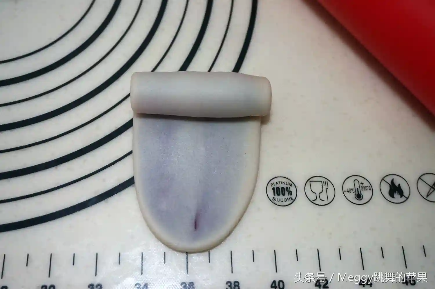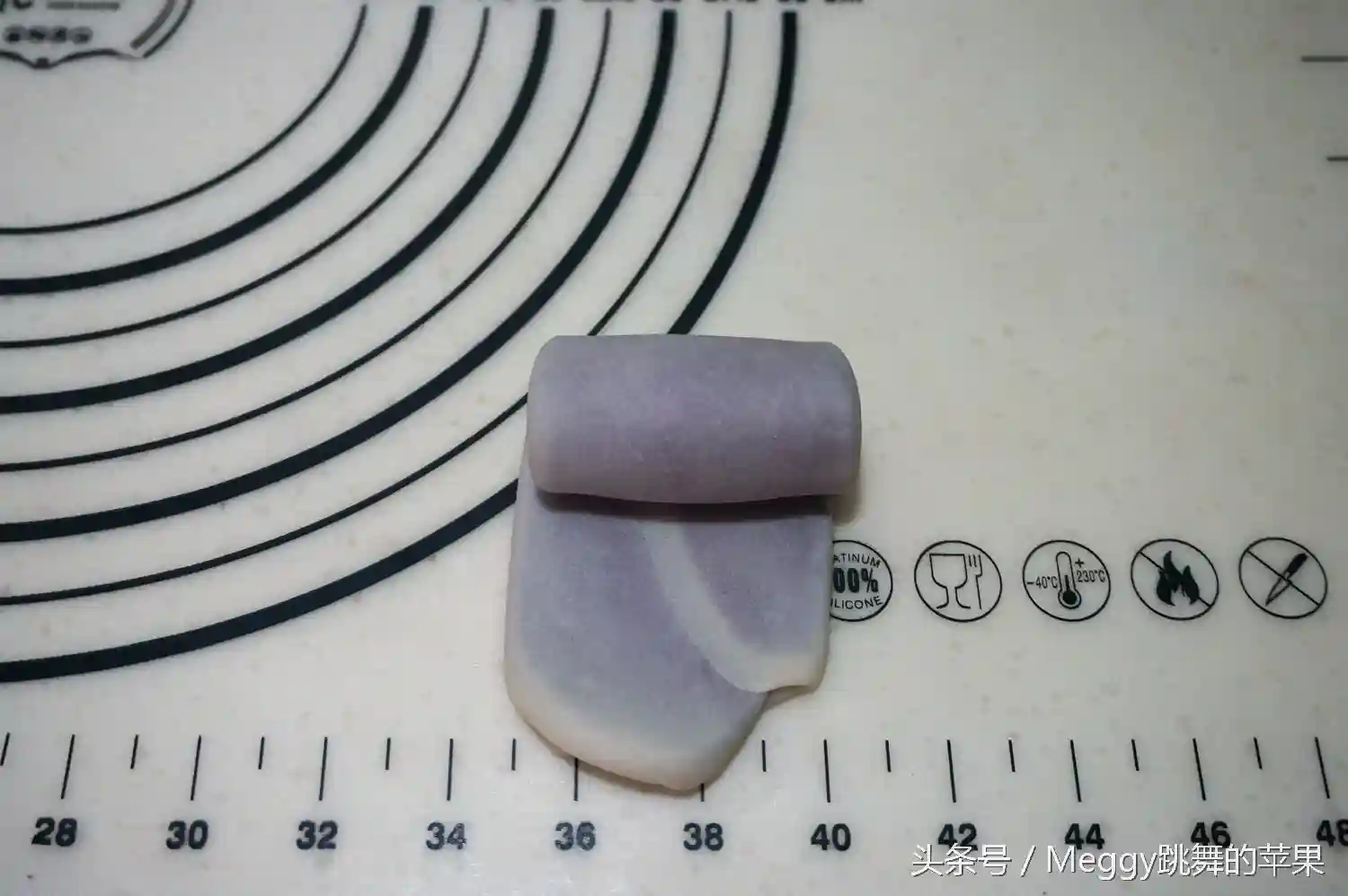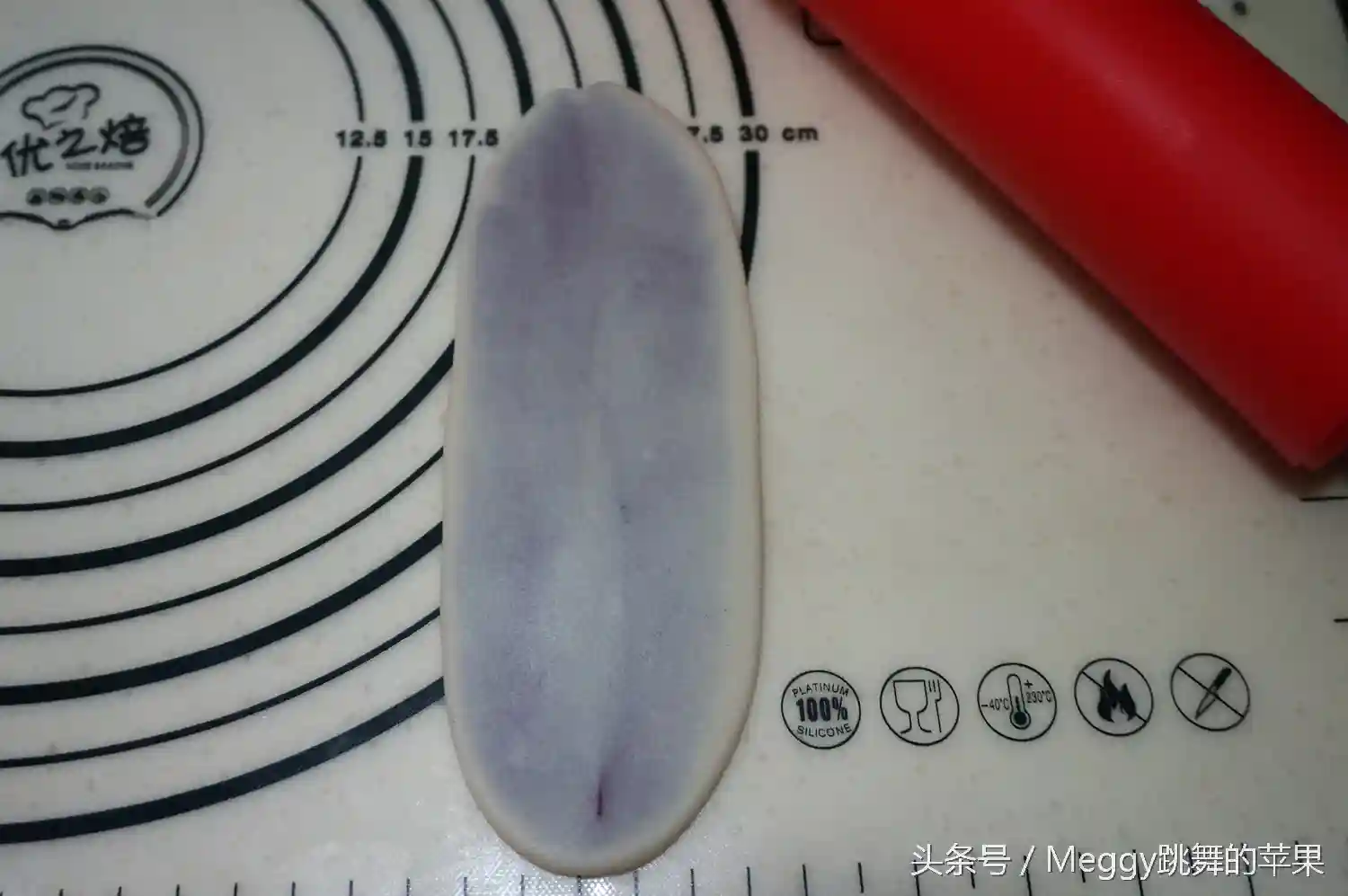 20.再取一个松弛好的面卷,用硅胶擀面棍在中间轻压一下,再往上擀一下,再往下擀一下,擀成长方形;