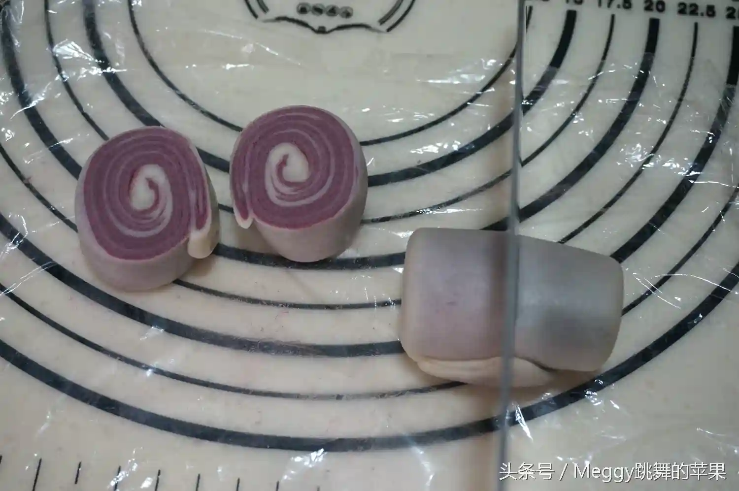 22.取一个面卷,用利刀拦腰一切,切面朝上,可以看到里面的花纹一圈圈;