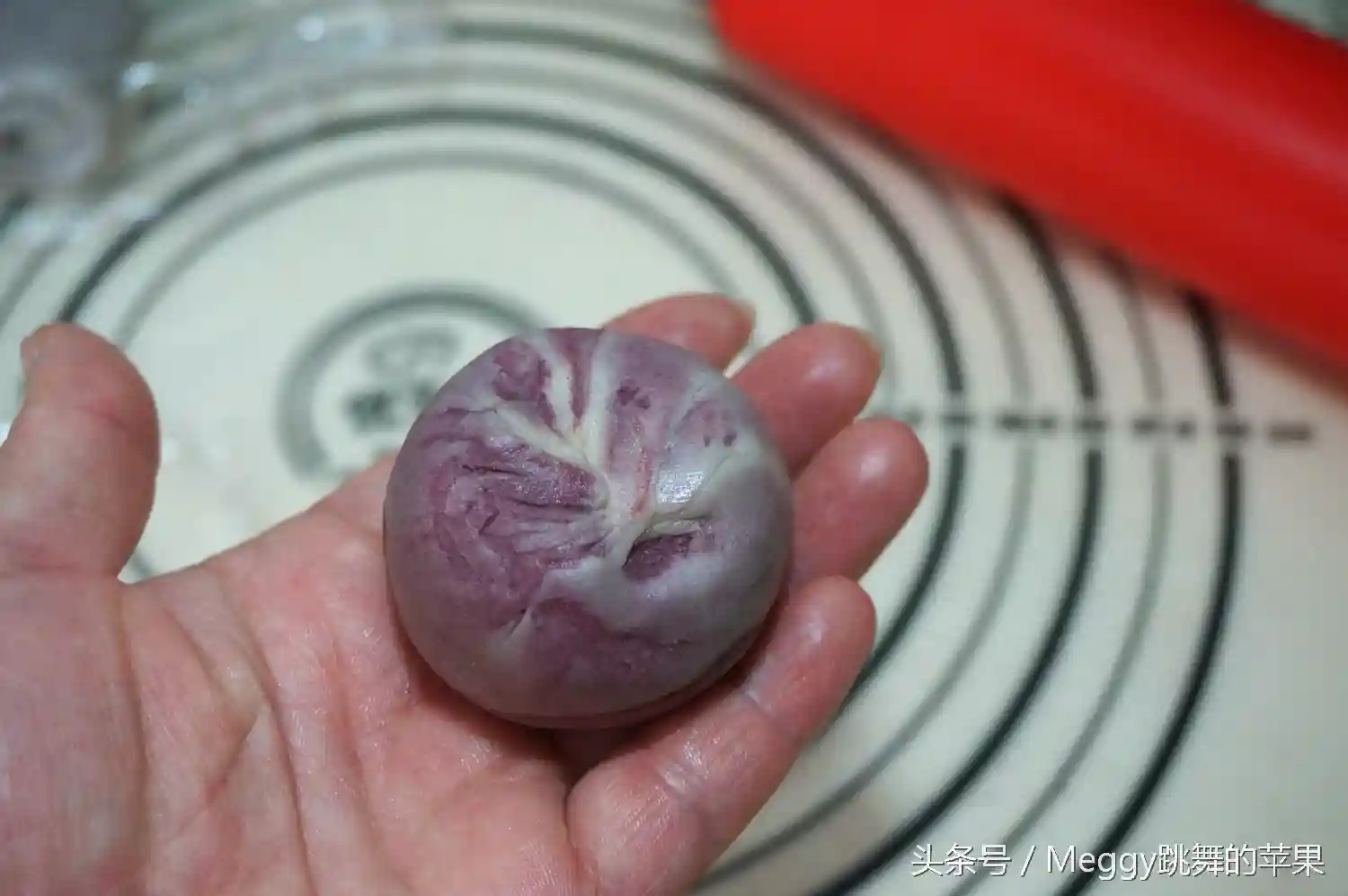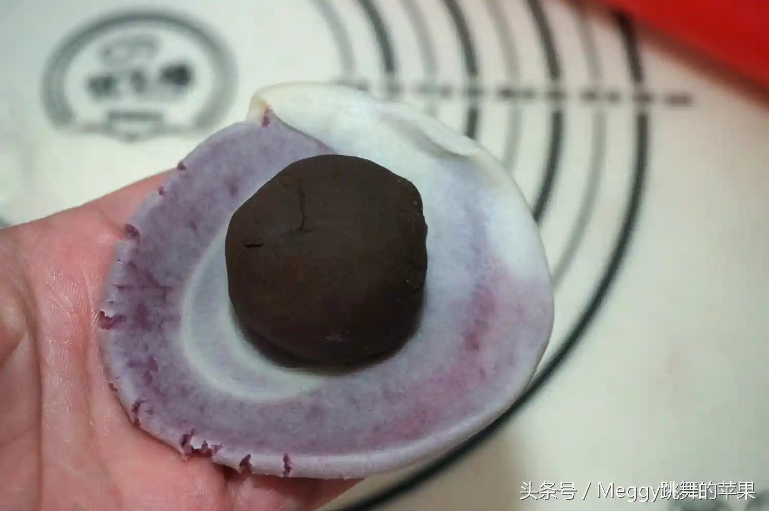 15.取一个水油皮面团,用手按扁,中间略厚、边缘稍薄,将一个紫薯油酥球放在上面;