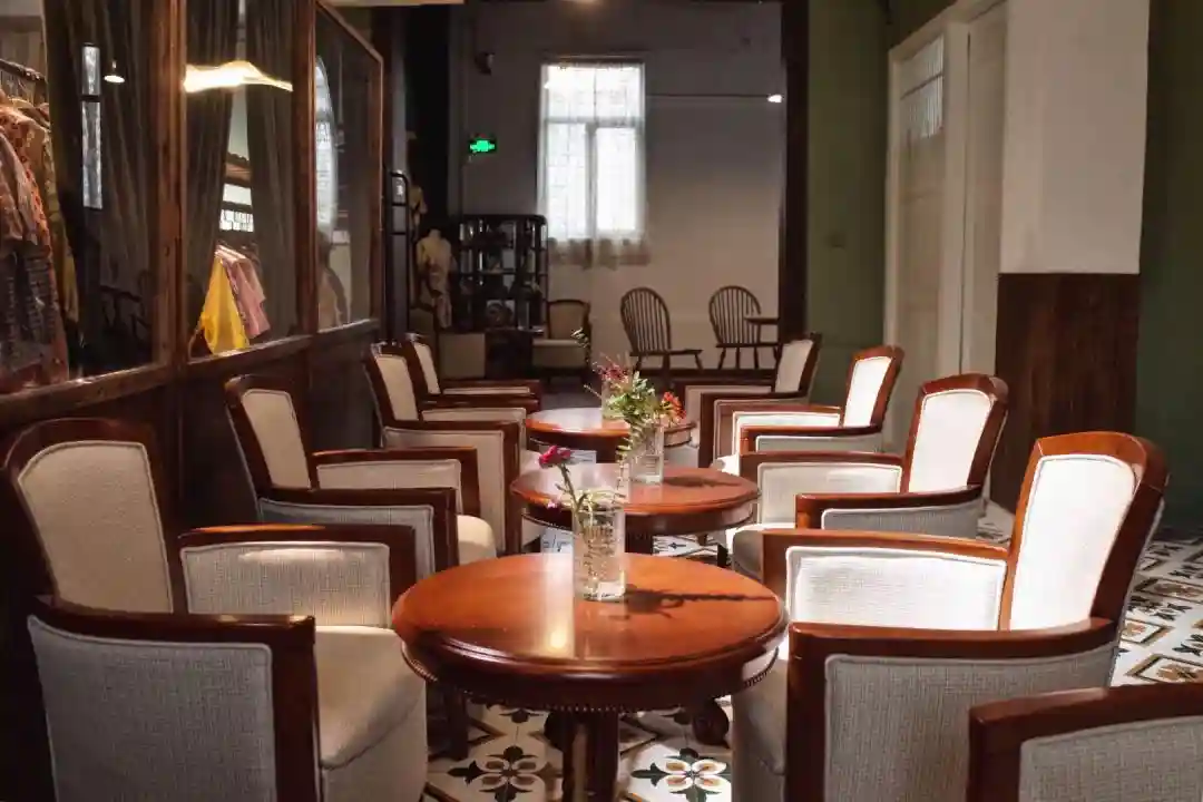 就餐区在二楼,午后的阳光透过玻璃窗,在木质桌椅上投射出一片片斑驳的光影,让你仿佛身处自然之中,又融于老旧的年代感里。