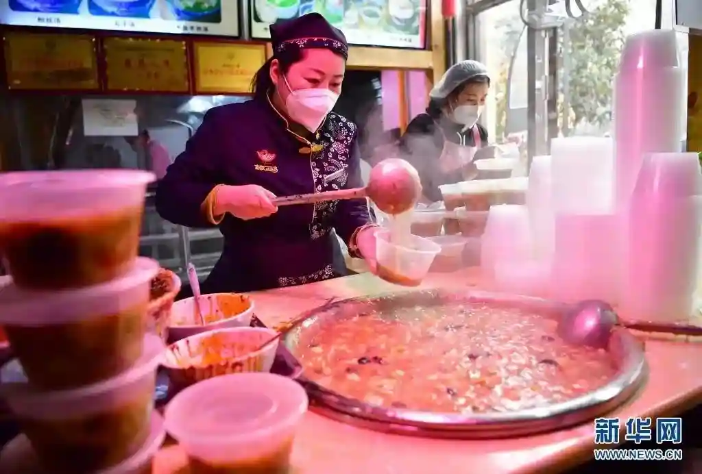 1月20日,在西安市曲江新区一家小吃店内,工作人员在制作胡辣汤。新华社记者邵瑞摄