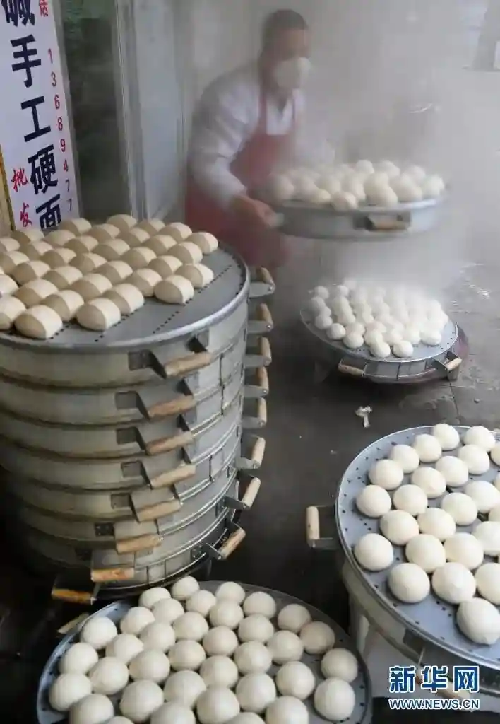 1月22日,西安市碑林区红缨路一家开业的食品店,工作人员在加工馒头。新华社记者陶明摄