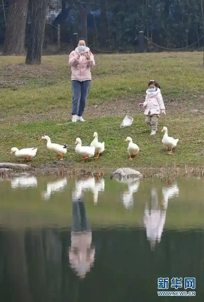 1月20日,在西安曲江池遗址公园内,家长带领小朋友在水边嬉戏。新华社记者邵瑞摄