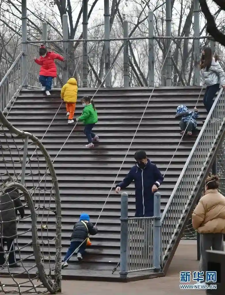 1月20日,家长陪同小朋友在西安曲江池遗址公园内玩耍。新华社记者邵瑞摄