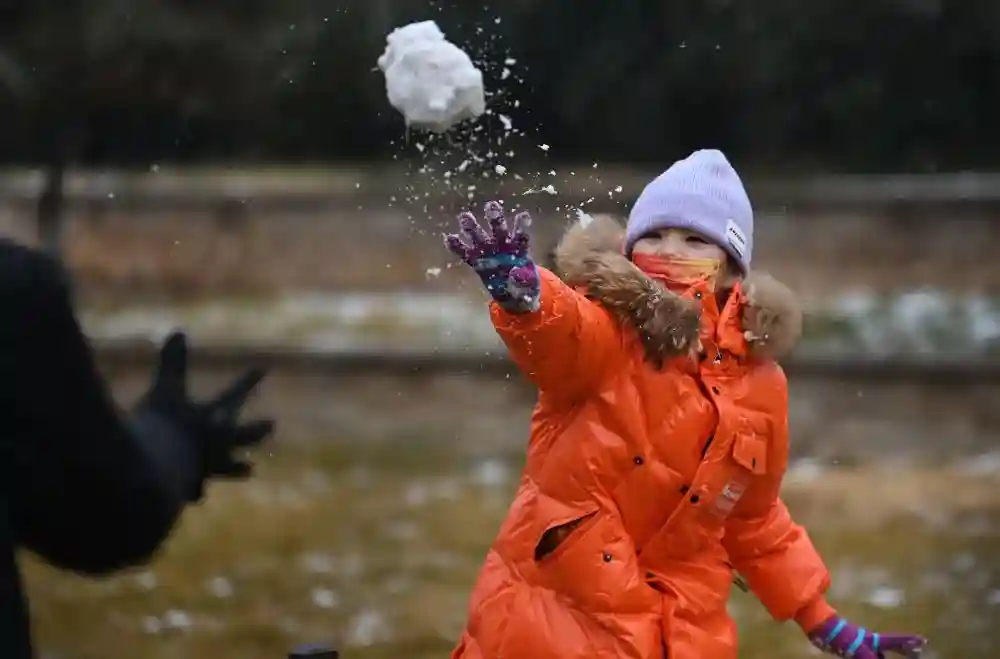 1月23日,小朋友在街头与家人打雪仗。新华社记者陶明摄