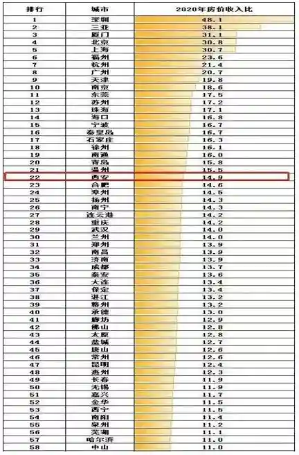 据诸葛找房平台统计,2020年平均房价收入比达13.2。而西安则位列全国第22,房价收入比为14.9。这意味着在西安买房不吃不喝要将近15年才能买得起。