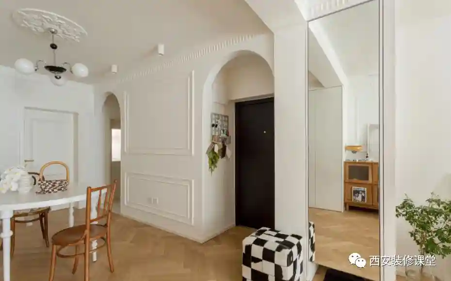 ▲一半木门一半镜面柜门,突出视觉层次,同时又能满足全身镜的功能
